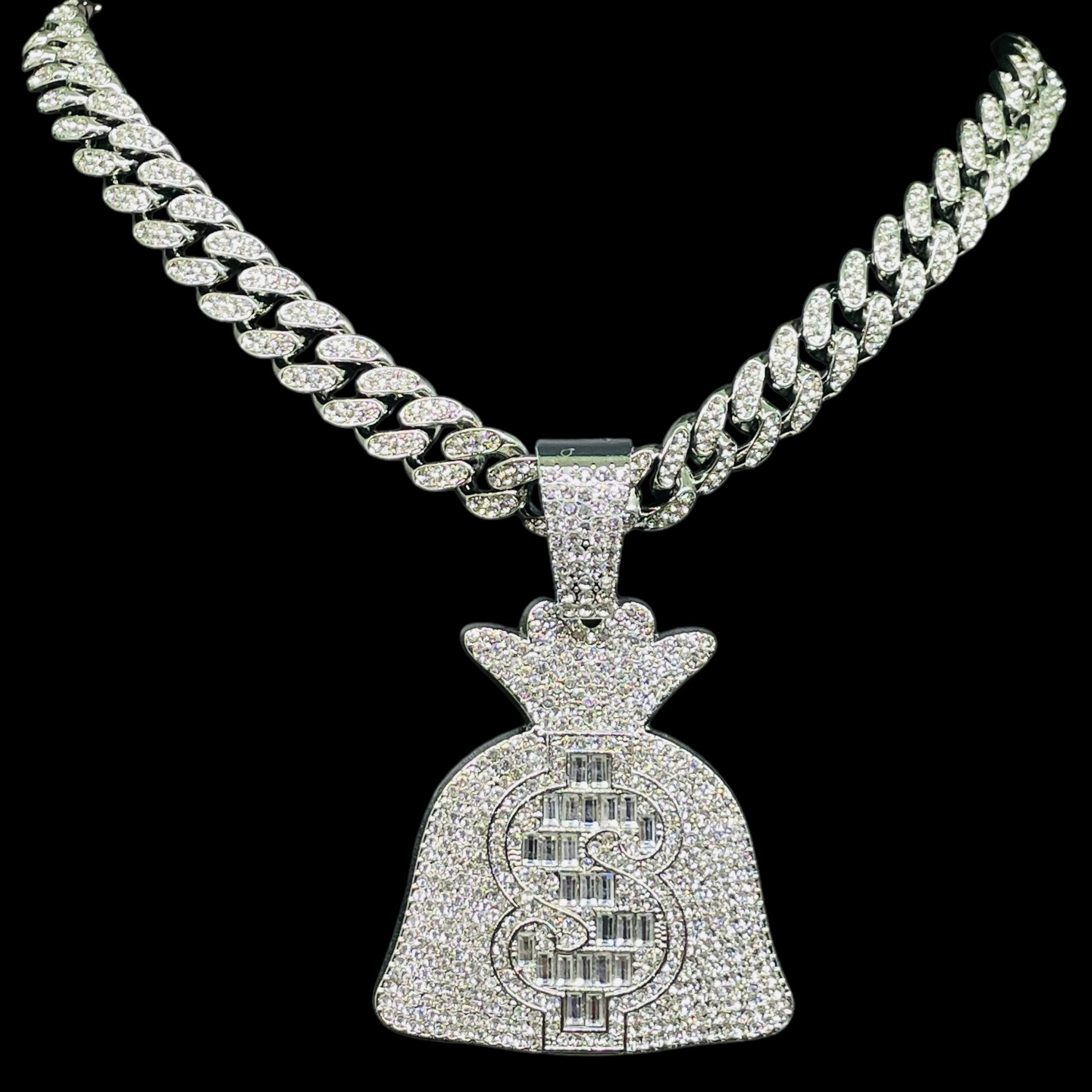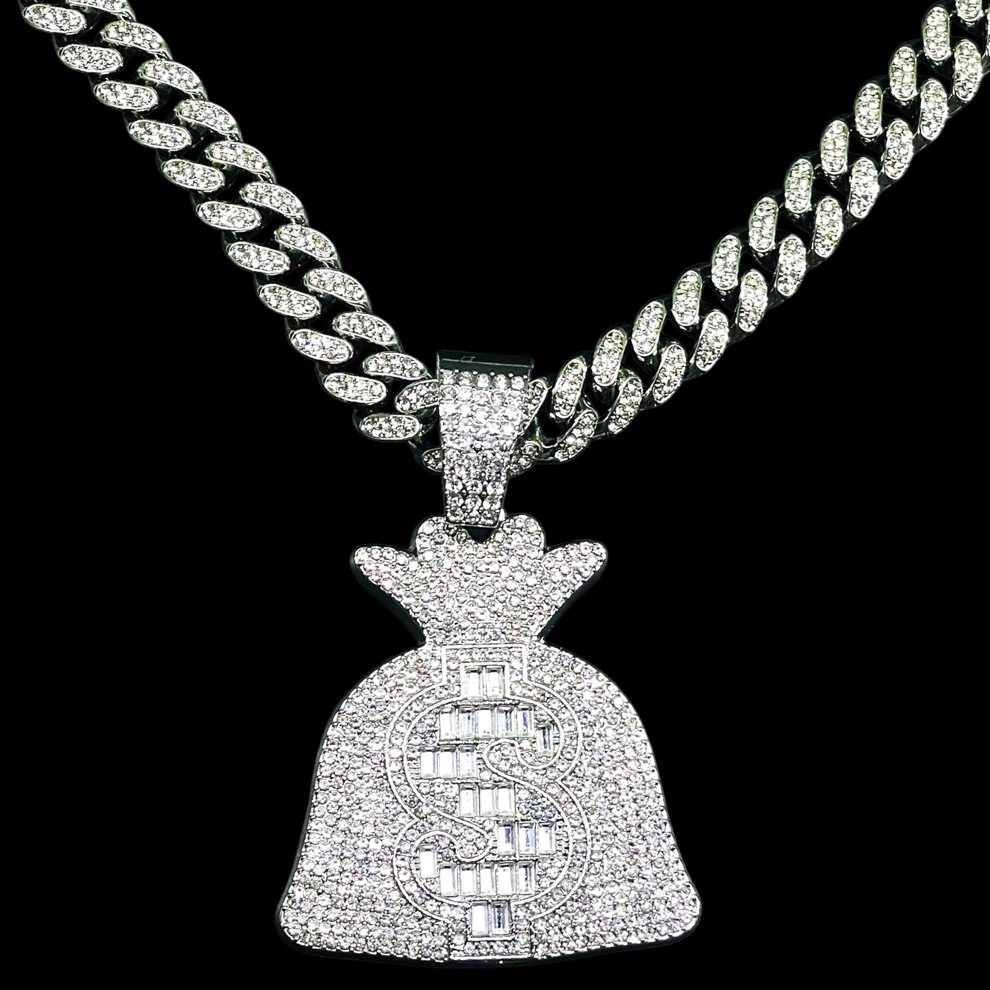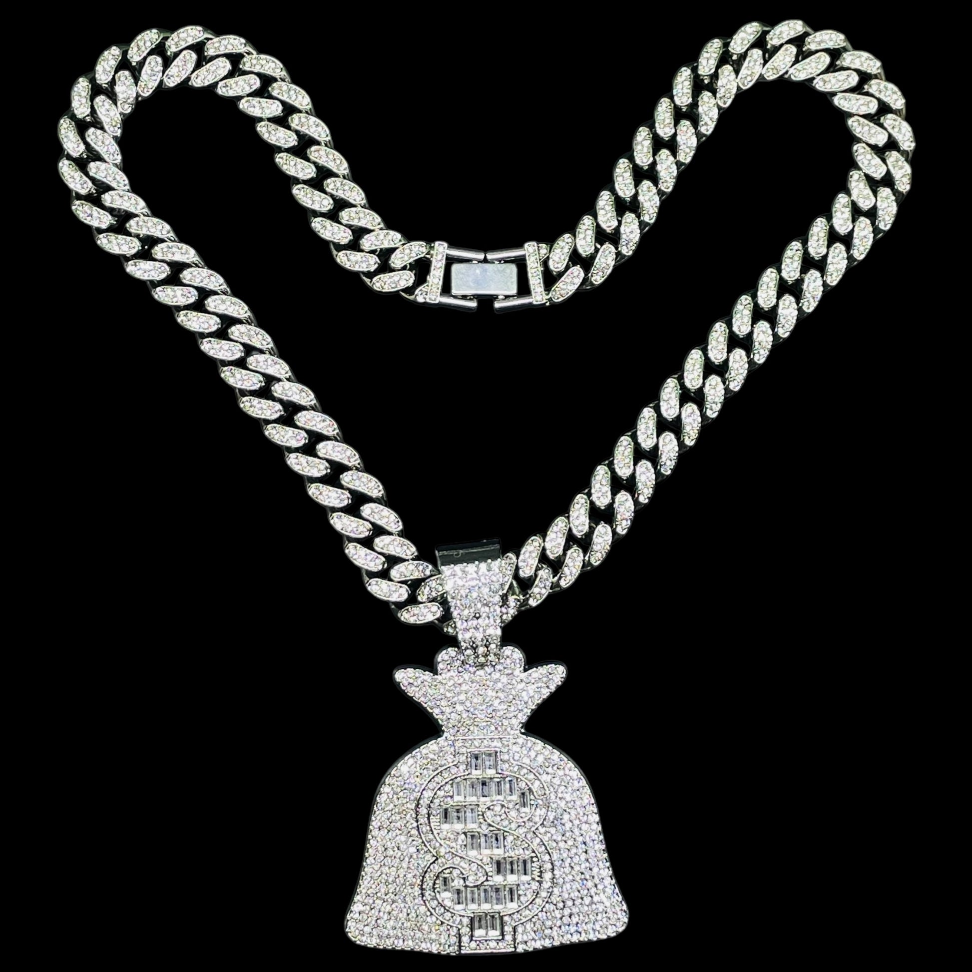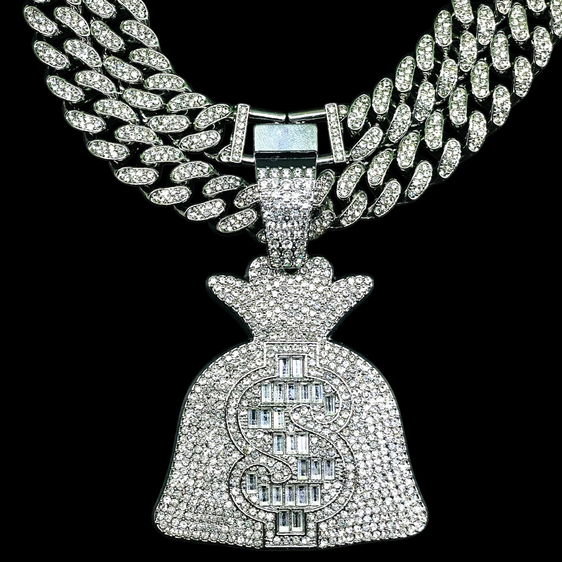 Iced Out Money Bag Pendant Chain – Hip Hop Bling Cuban Link Necklace