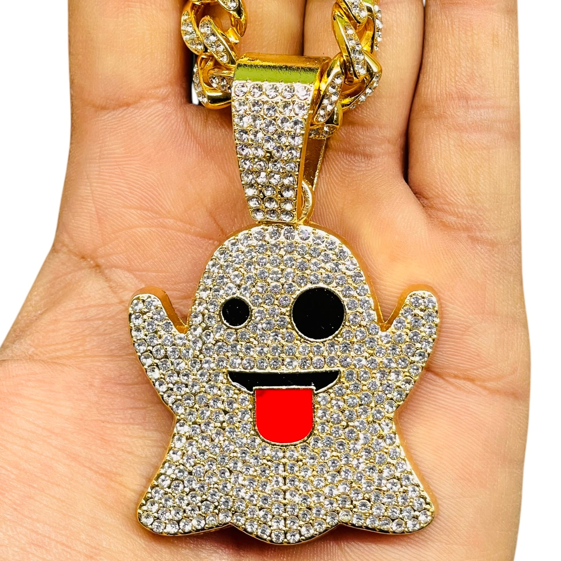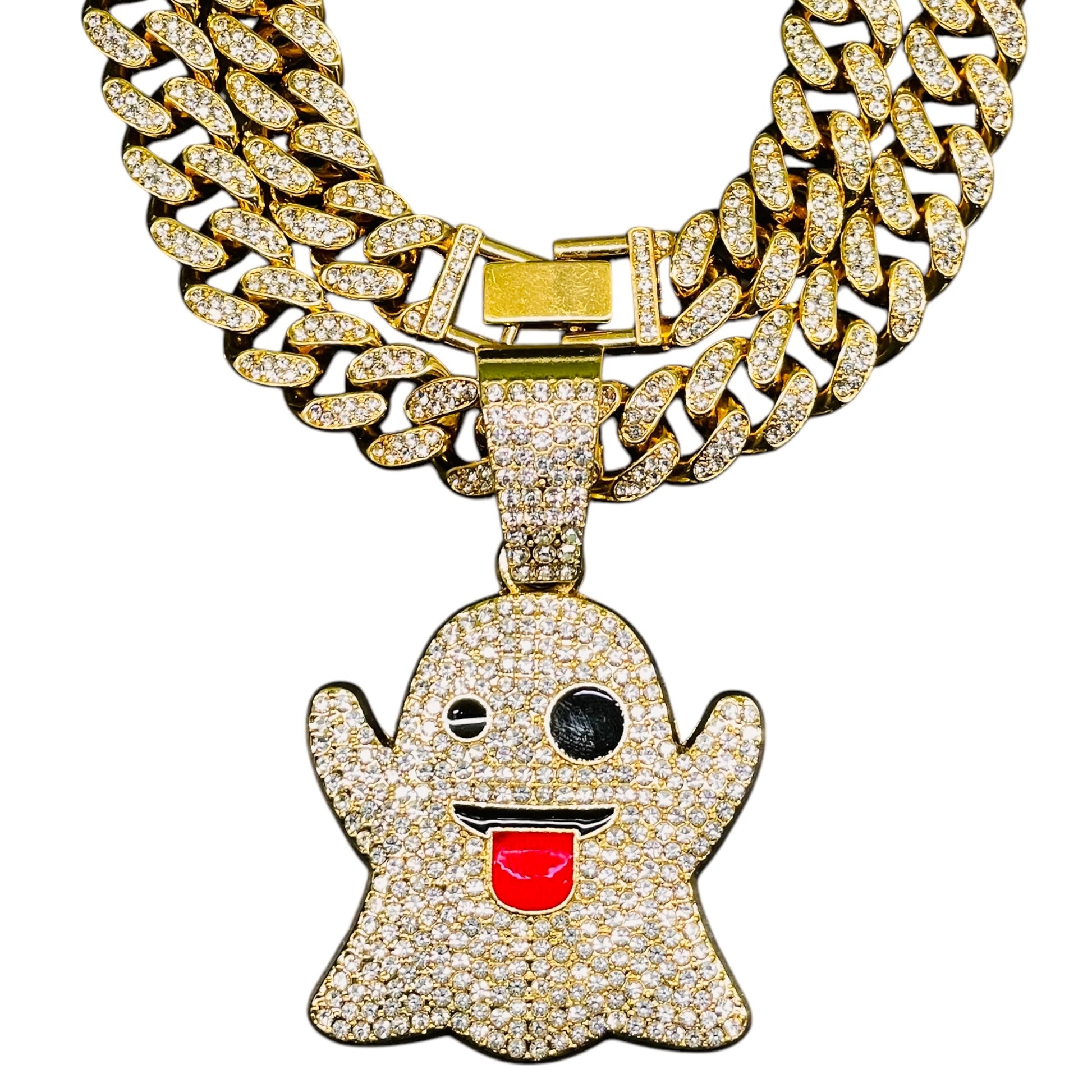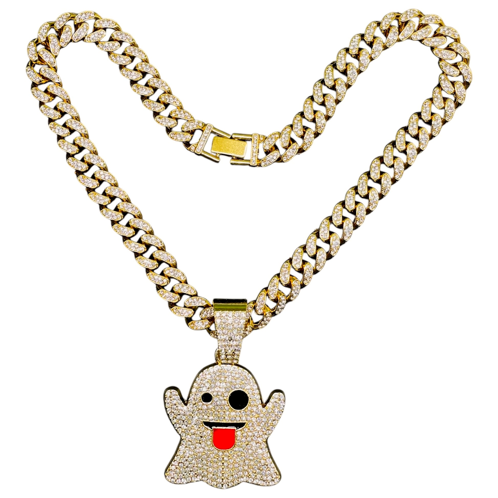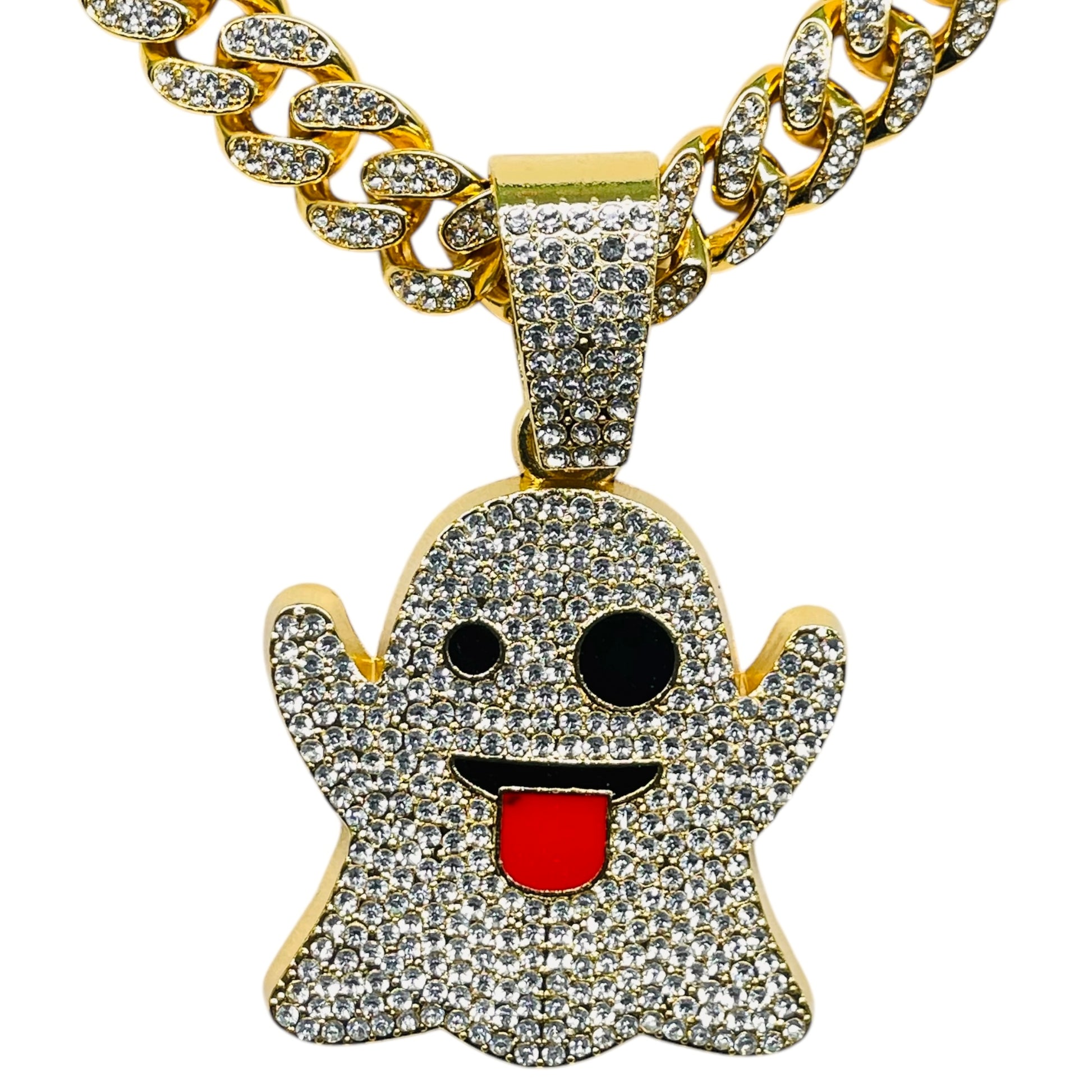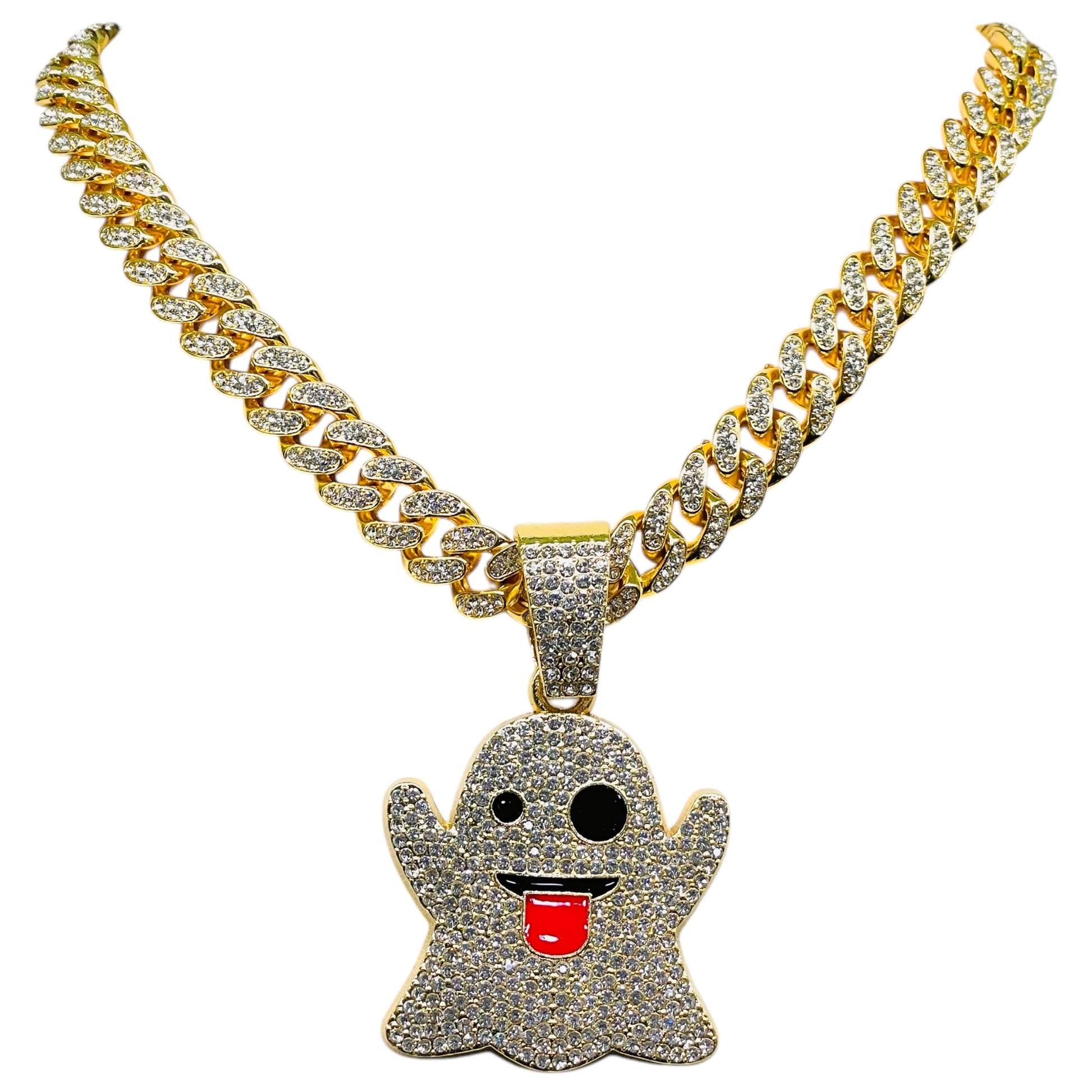 Iced Out Ghost Emoji Pendant with Gold Cuban Chain – Hip Hop Bling Necklace