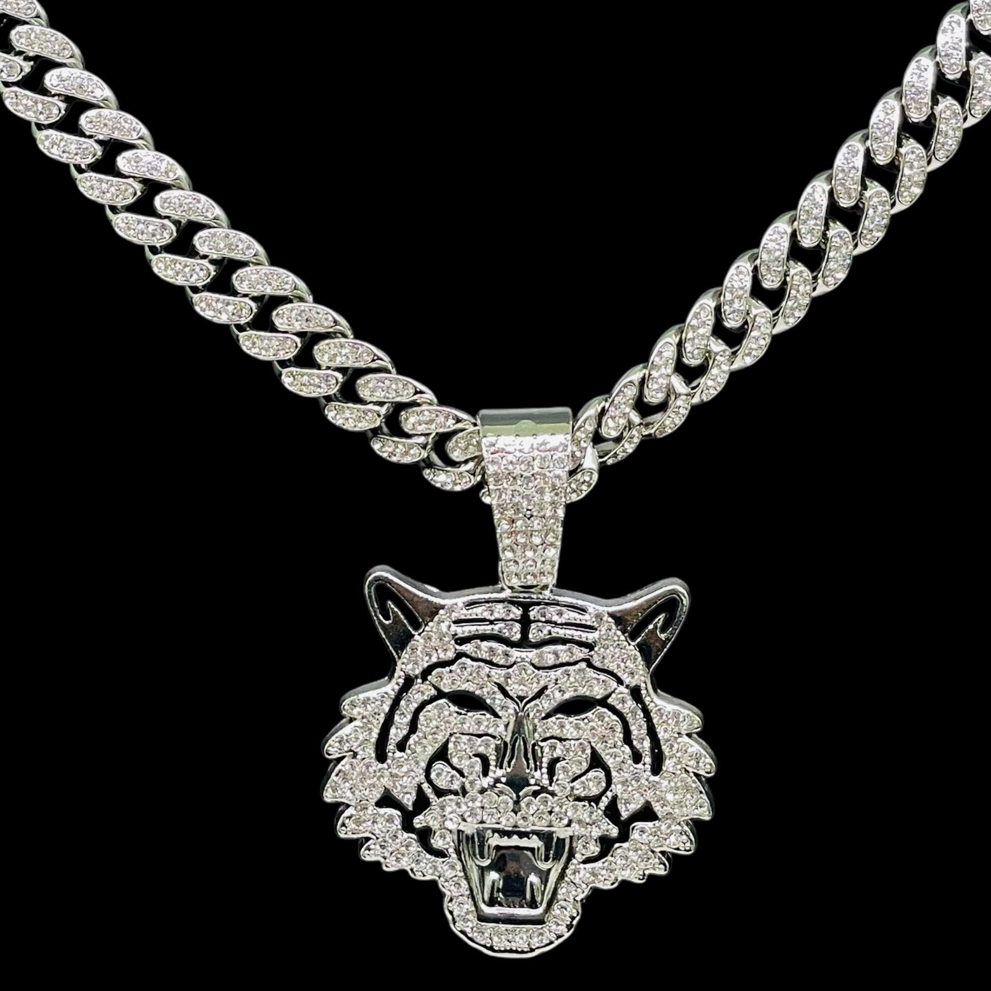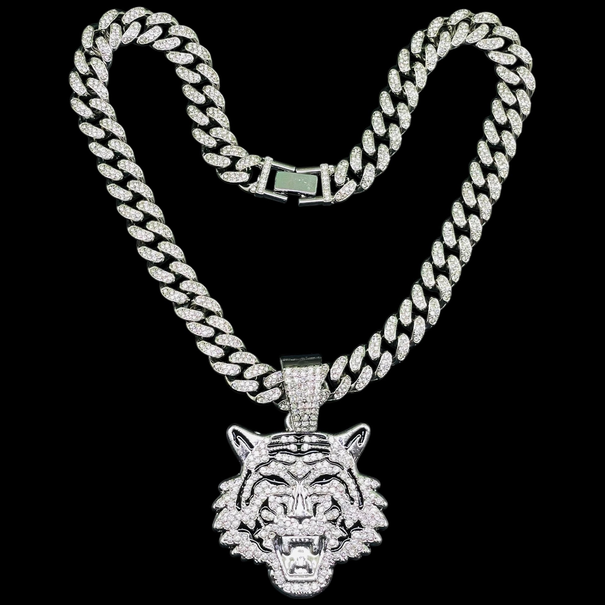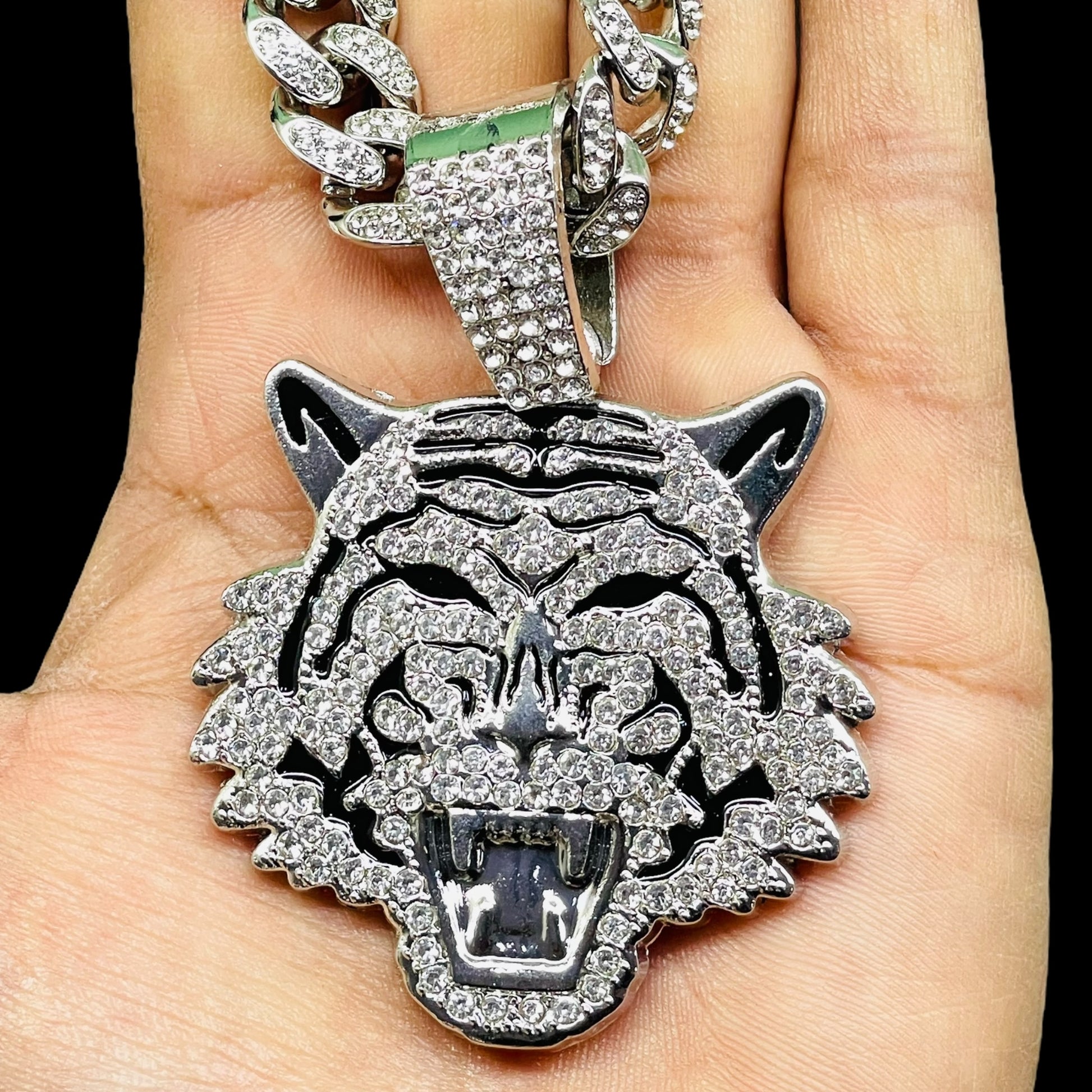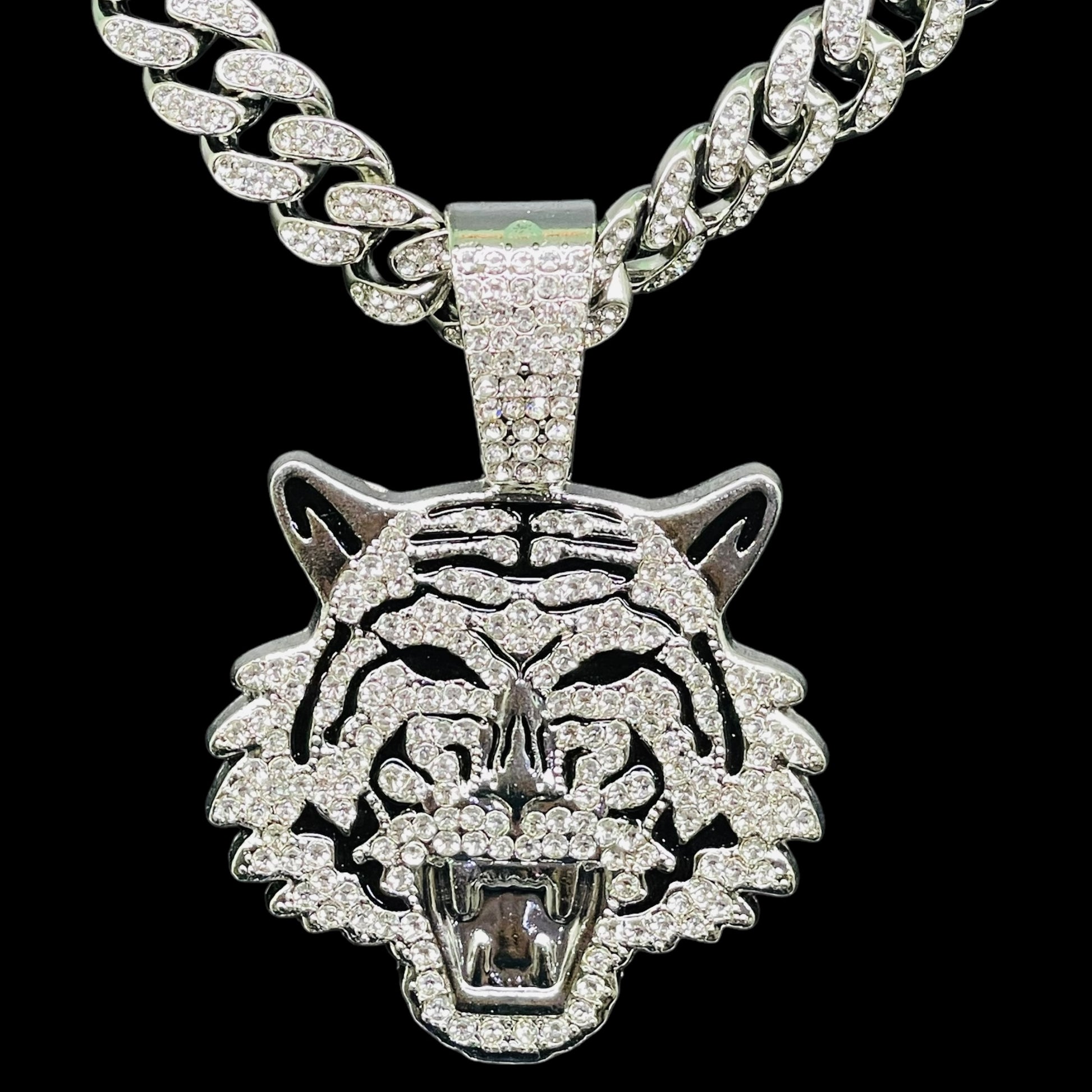 Iced Out Roaring Tiger Pendant Necklace – Silver Cuban Link Chain