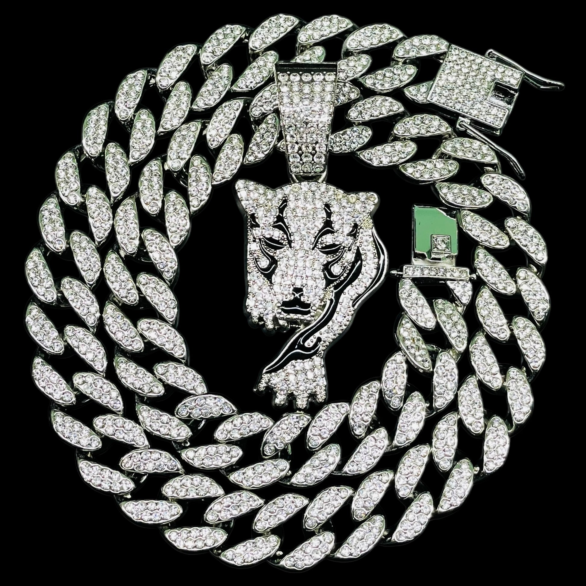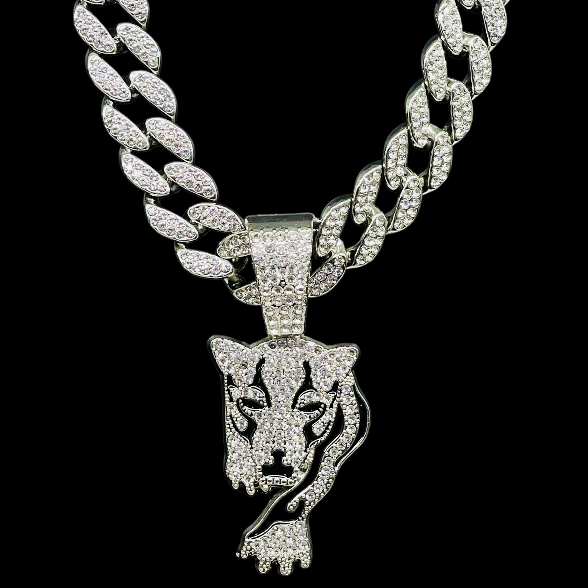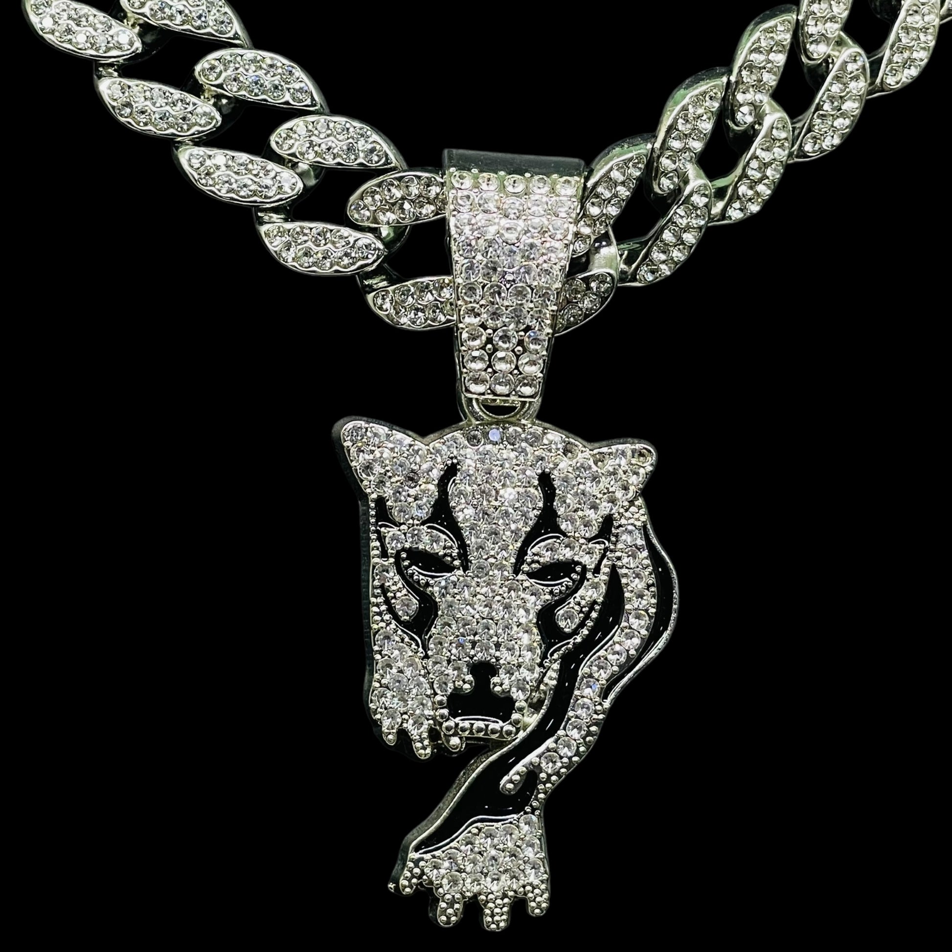 Stride into the spotlight with our Iced Out Walking Tiger Pendant Luxe Set. Fully encrusted with dazzling stones, this dynamic pendant captures the grace and power of a tiger on the prowl. Paired with a matching chain, it’s a fierce accessory that brings street-style edge and luxury shine to any outfit—perfect for those who lead with bold confidence and unstoppable energy.