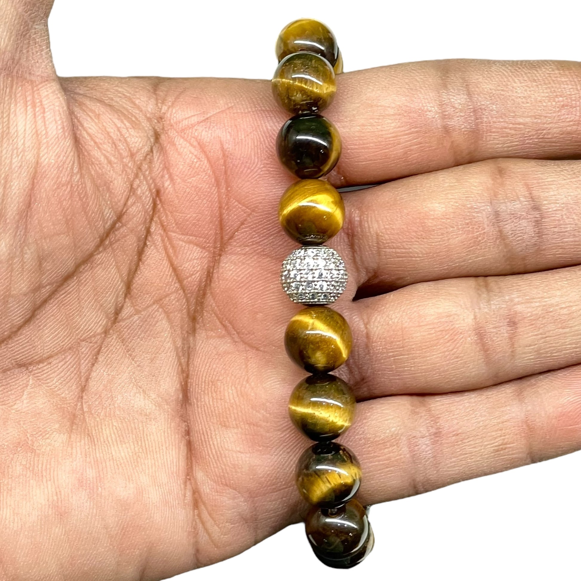 Handmade Tiger Eye Stretch Bracelet – 10mm Natural Beads with CZ Disco Ball, Unisex Healing Jewelry