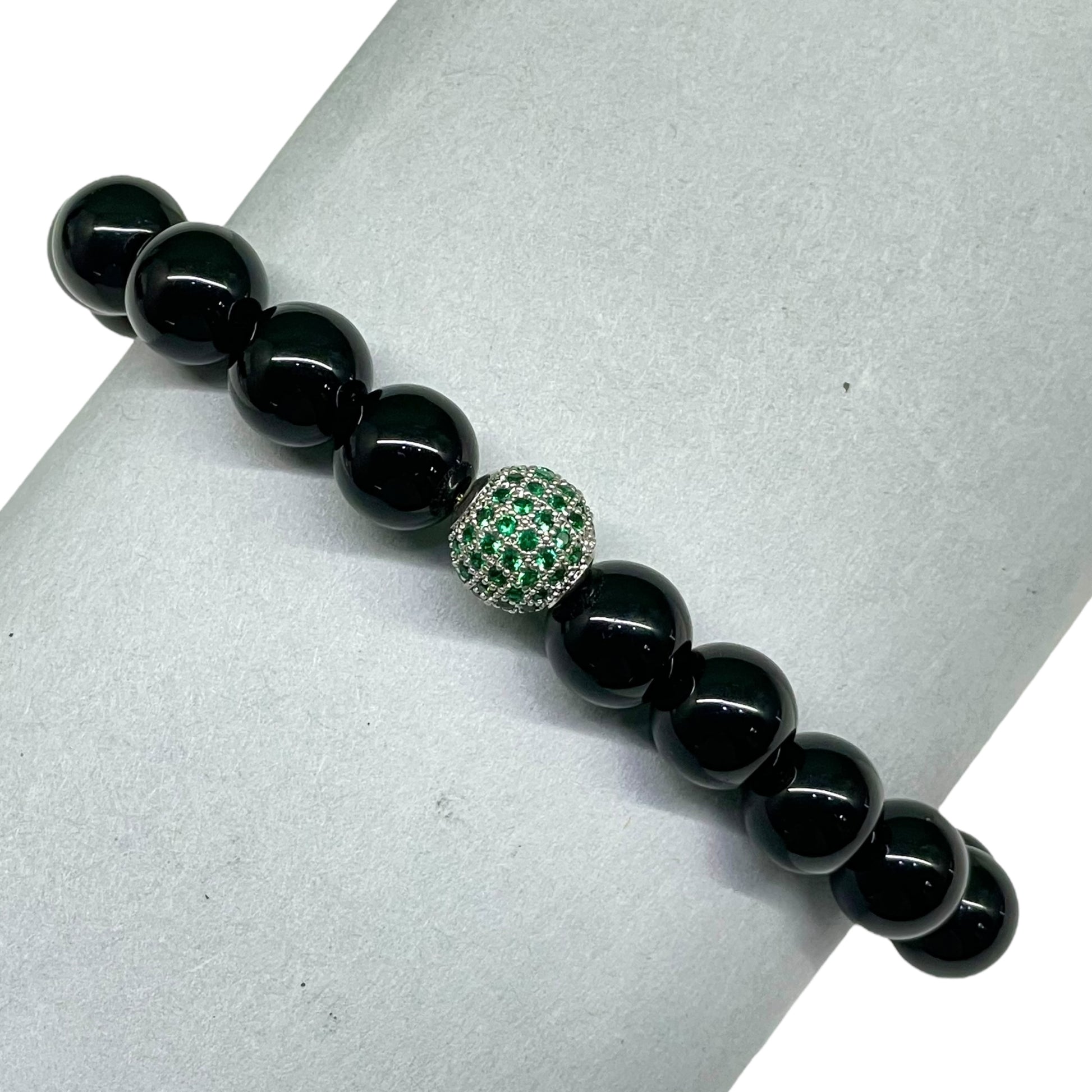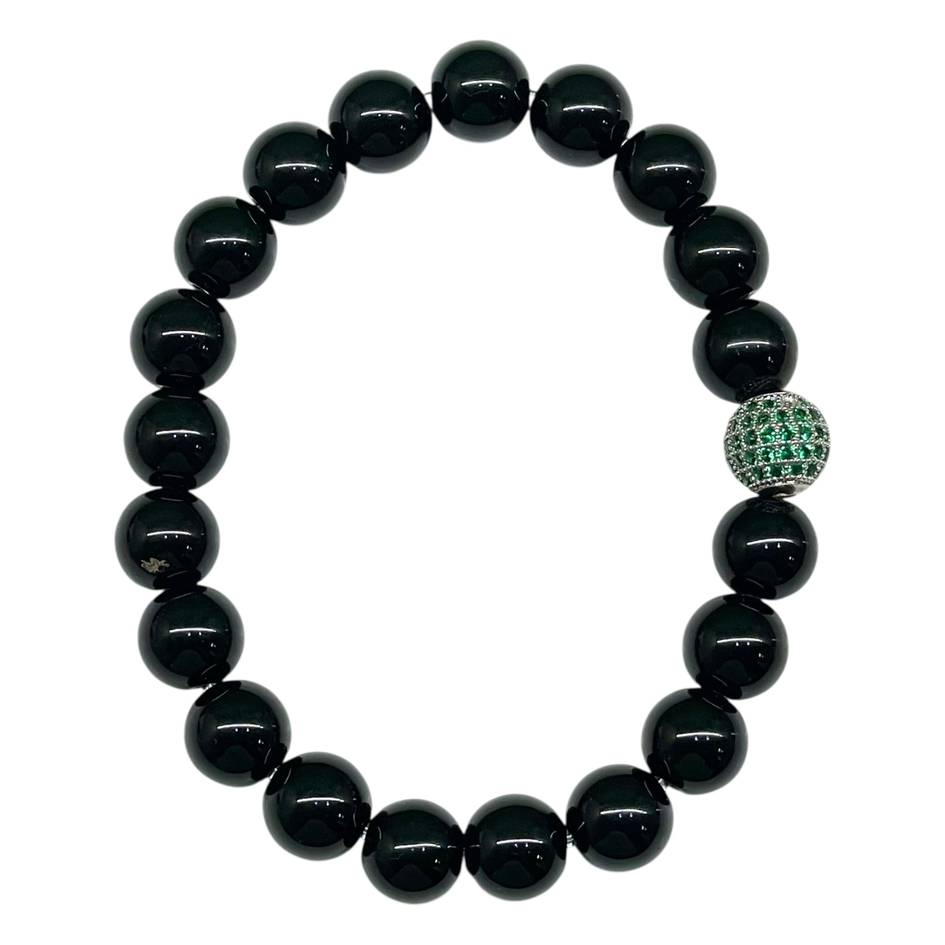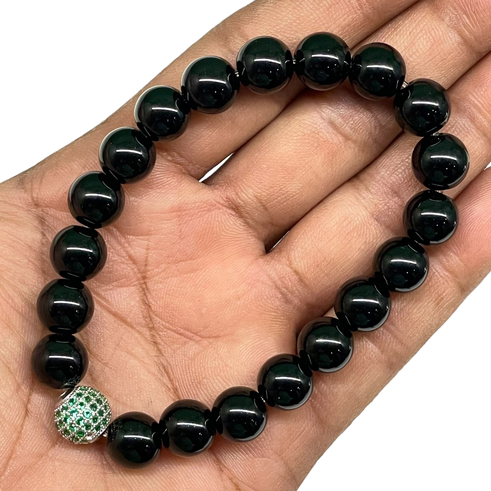 Handmade Black Onyx Stretch Bracelet – 10mm Natural Beads with CZ Disco Ball Accent