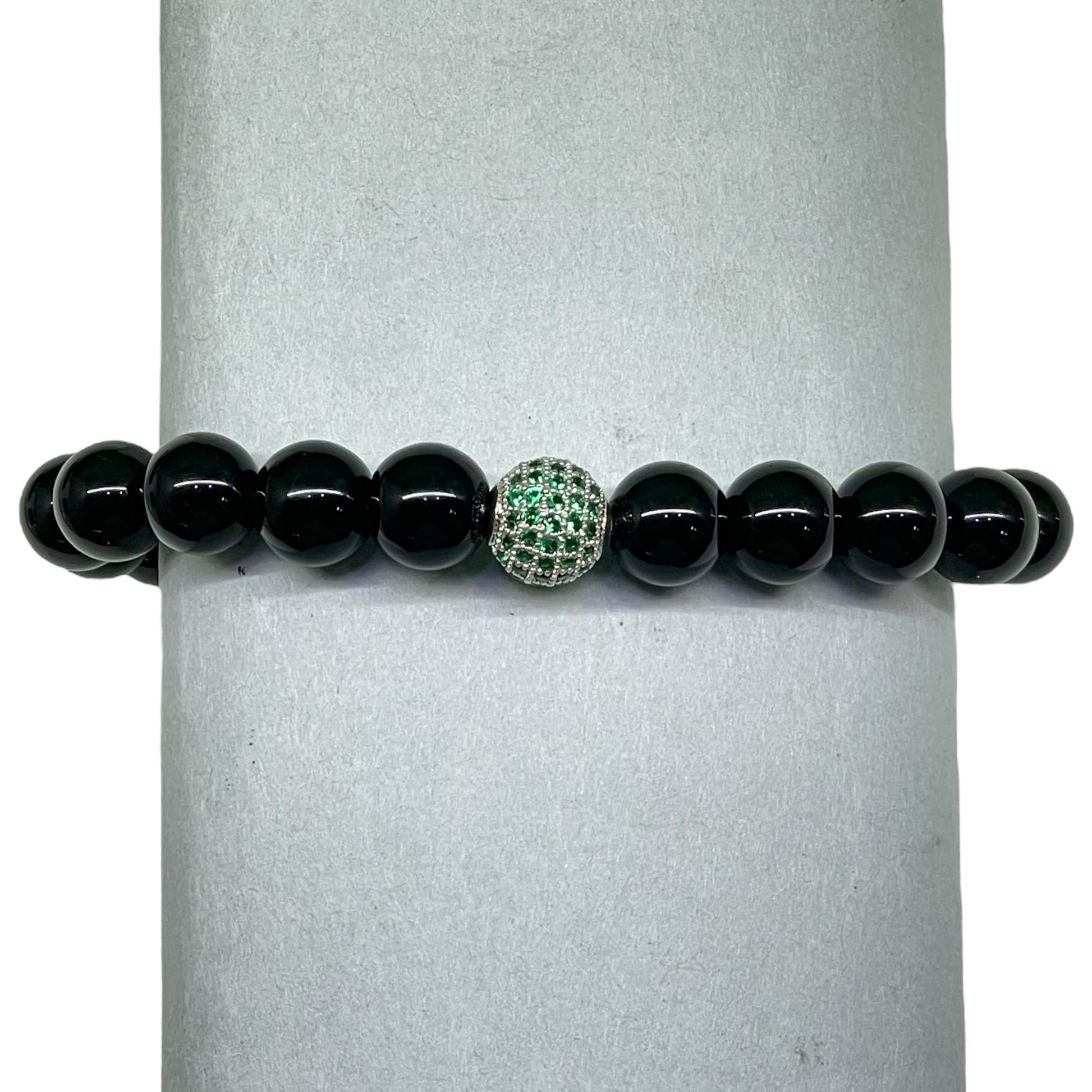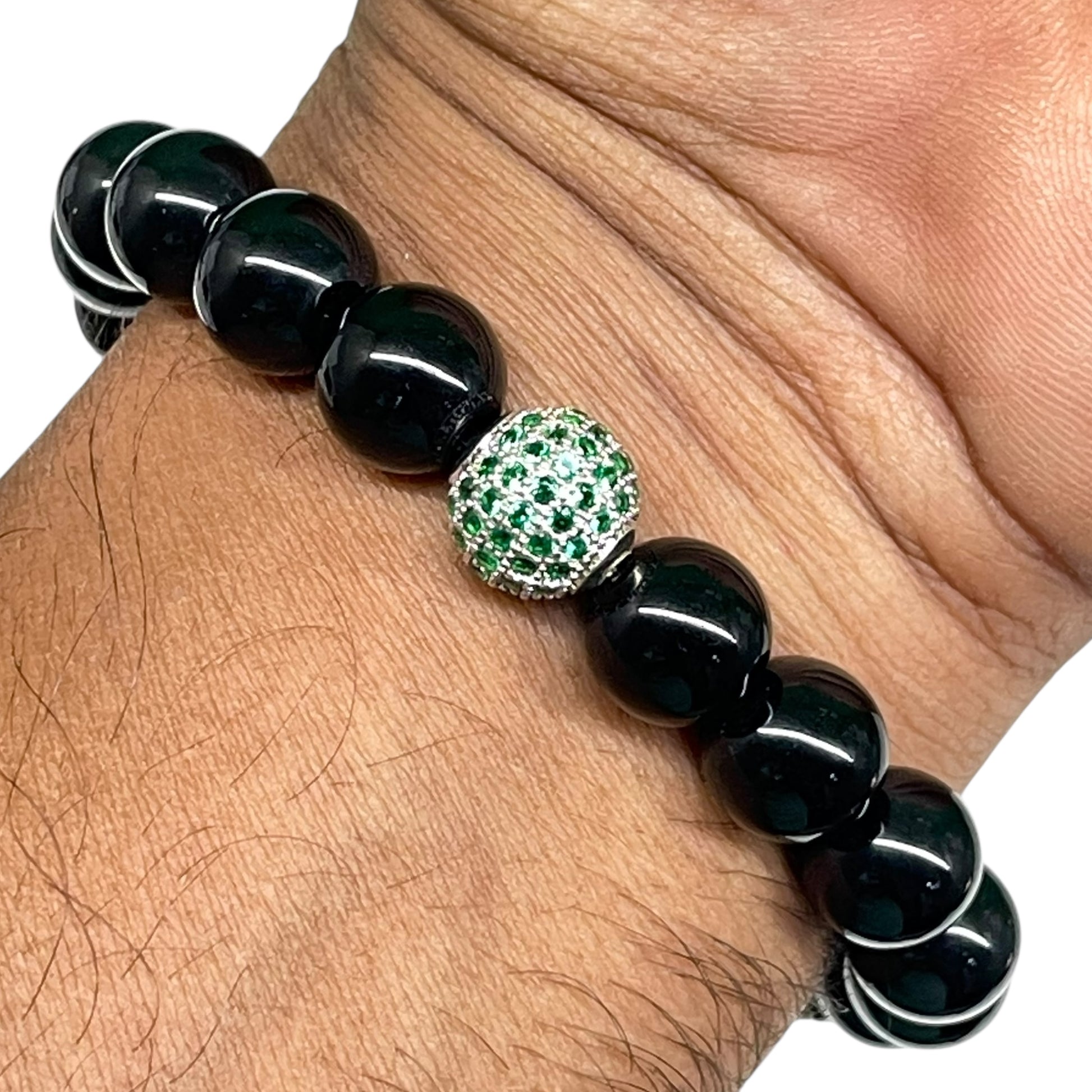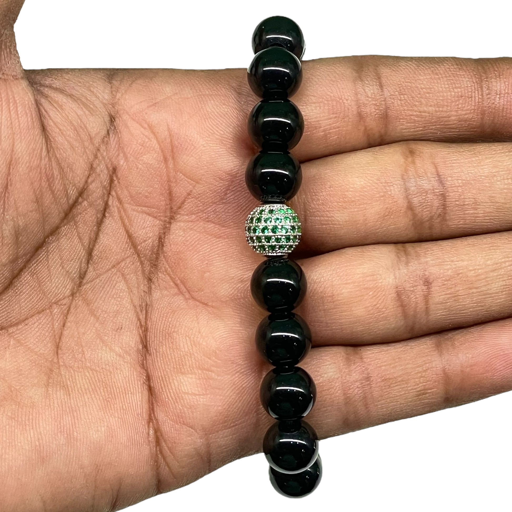 Handmade Black Onyx Stretch Bracelet – 10mm Natural Beads with CZ Disco Ball Accent