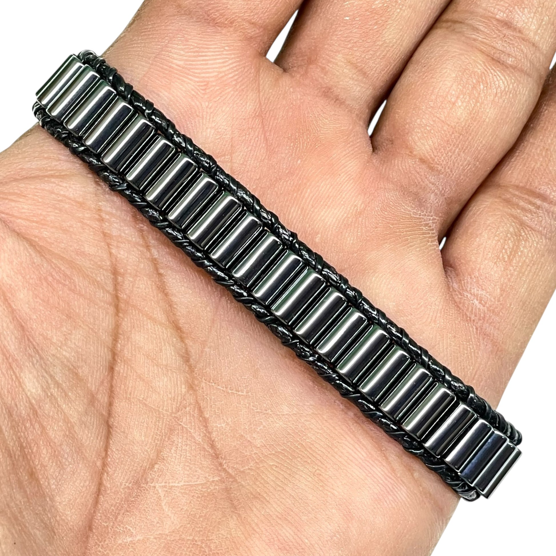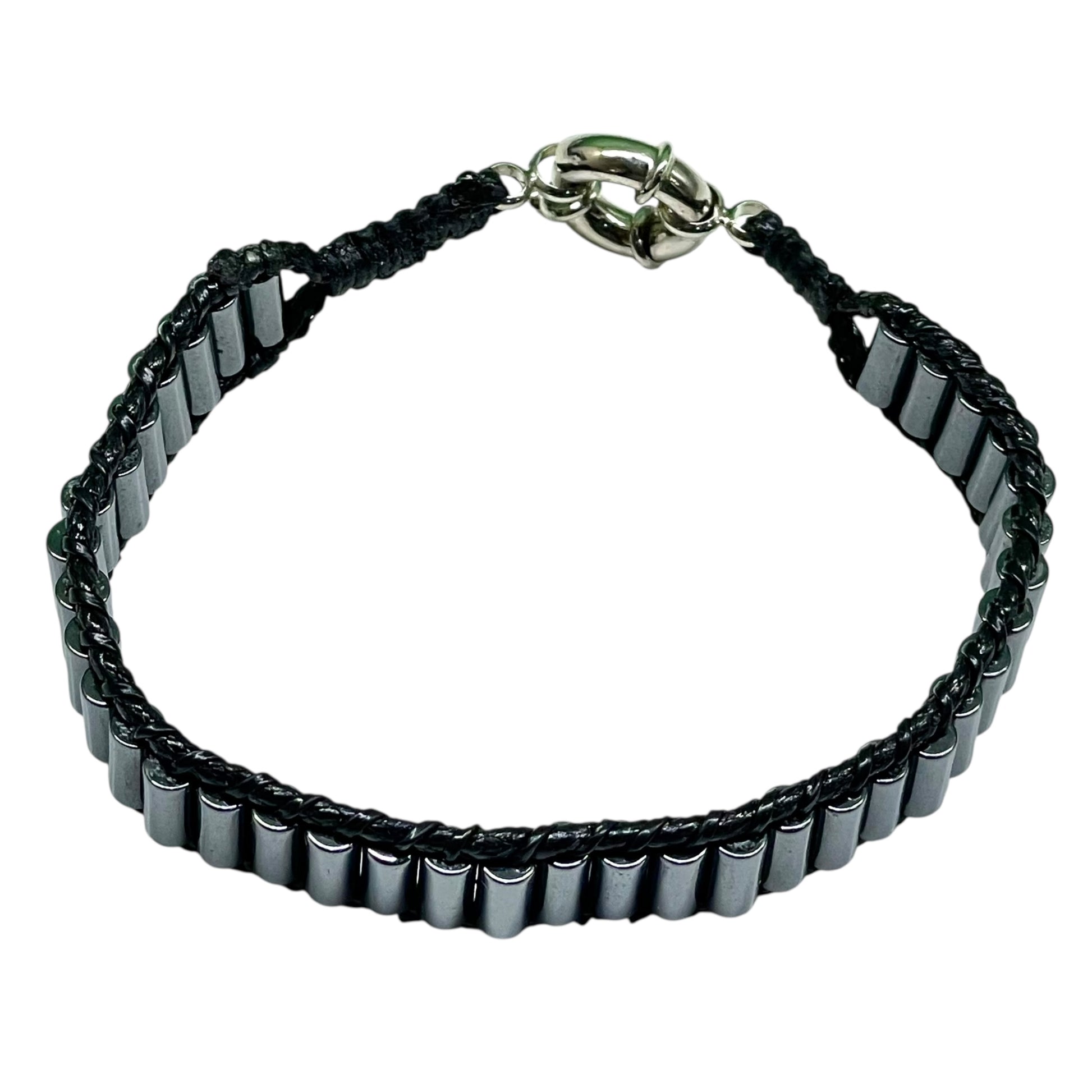 Handmade 8mm Hematite Tube Beads Bracelet – Black Cord Woven Jewelry with Clasp