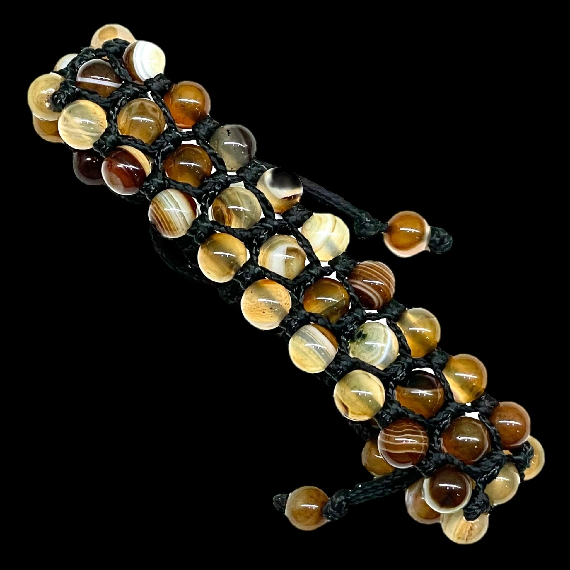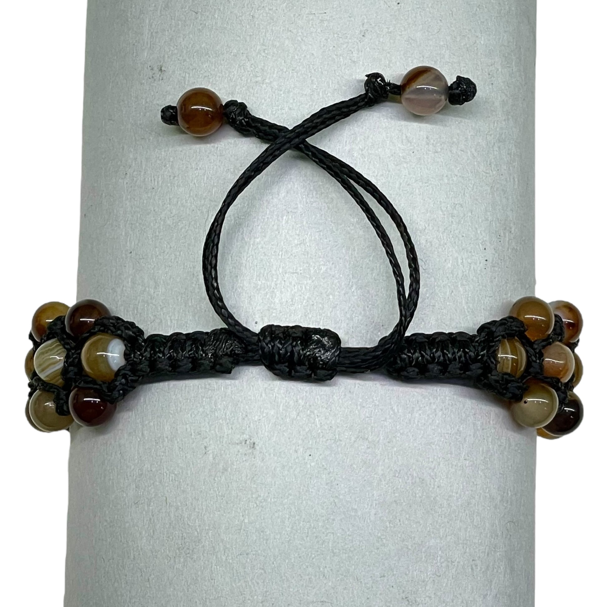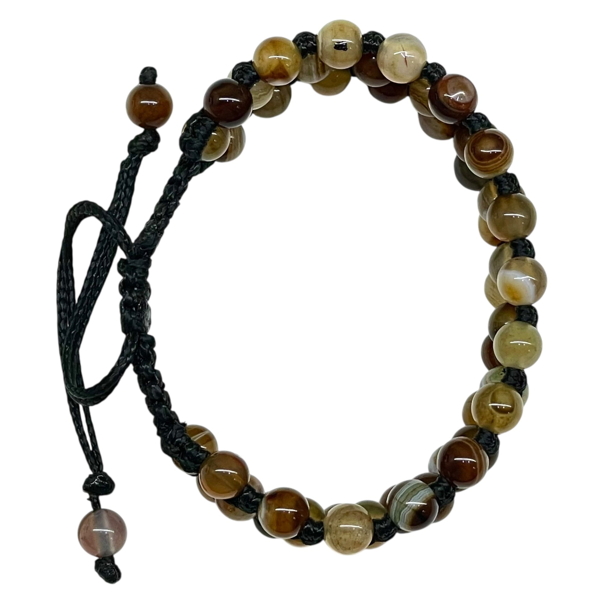 Add earthy elegance and grounding energy to your style with this handmade Agate bracelet, crafted with 6mm natural agate gemstone beads intricately woven on a strong black macrame cord. Each bead showcases unique natural patterns, making every bracelet one-of-a-kind. Agate is known as a stone of stability and protection, believed to bring balance, harmony, and emotional strength. Material: Genuine Agate Stone Beads Bead Size: 6mm Cord: Durable Adjustable Black Macrame Cord Style: Handmade, Boho-Inspired, Unisex Design Healing Benefits: Said to promote grounding, protection, and inner peace Perfect For: Meditation, yoga, casual wear, or as a meaningful gift This versatile agate beaded bracelet blends natural gemstone beauty with artisanal craftsmanship, making it a stylish accessory for everyday wear or spiritual practice.