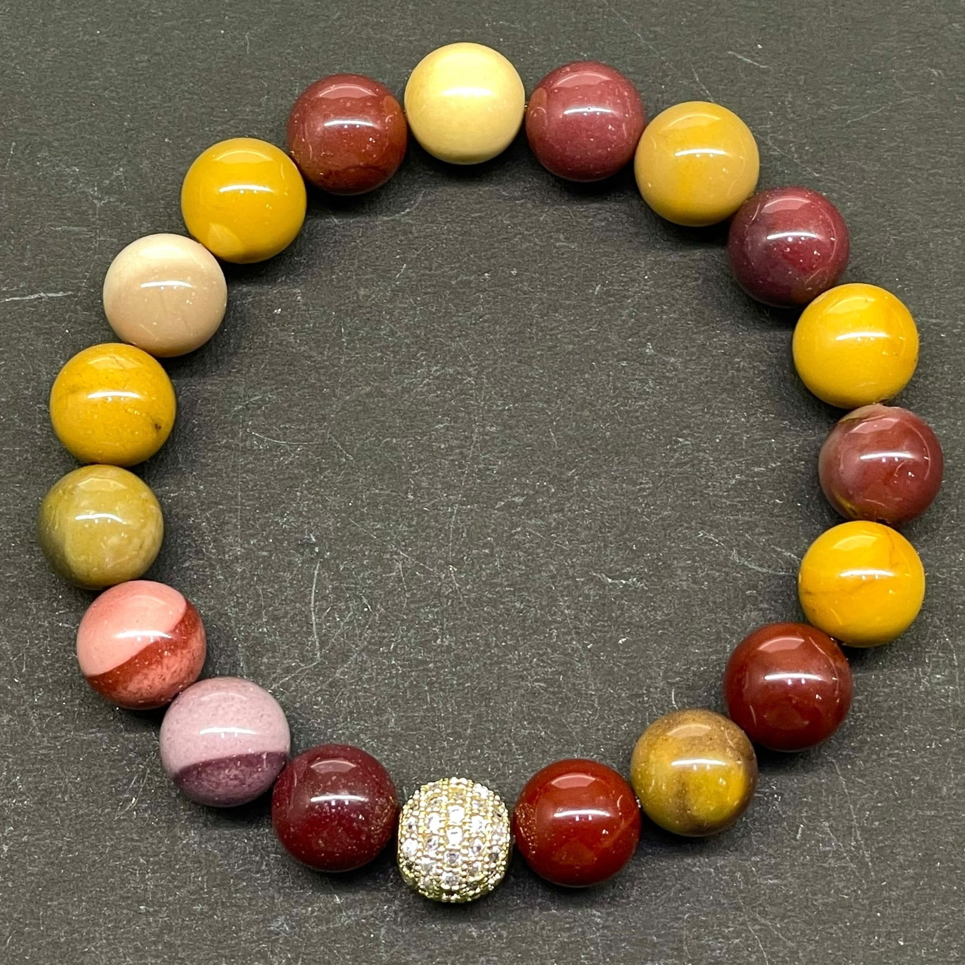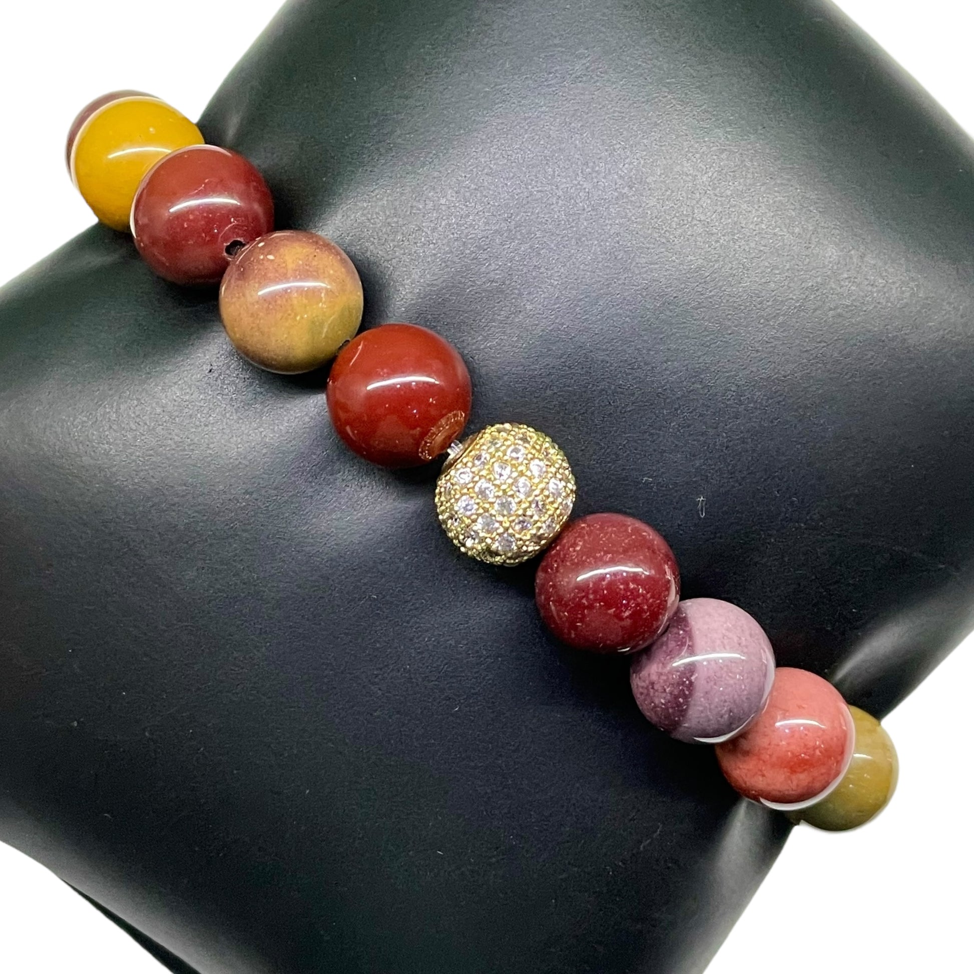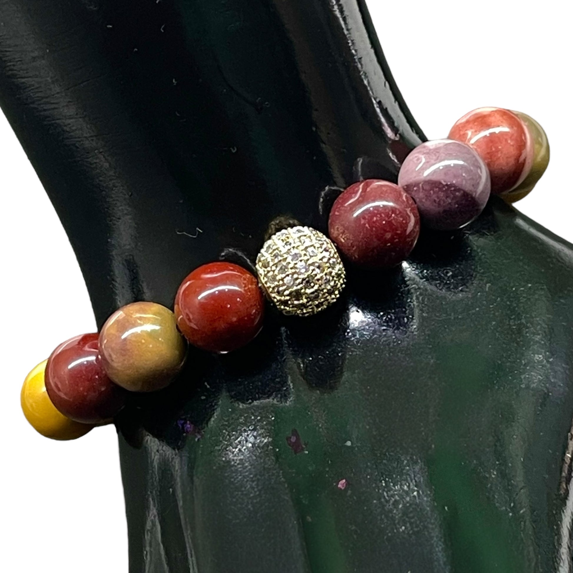 Handmade Mookaite Jasper Stretch Bracelet – 10mm Natural Beads with Golden Disco Ball Accent
