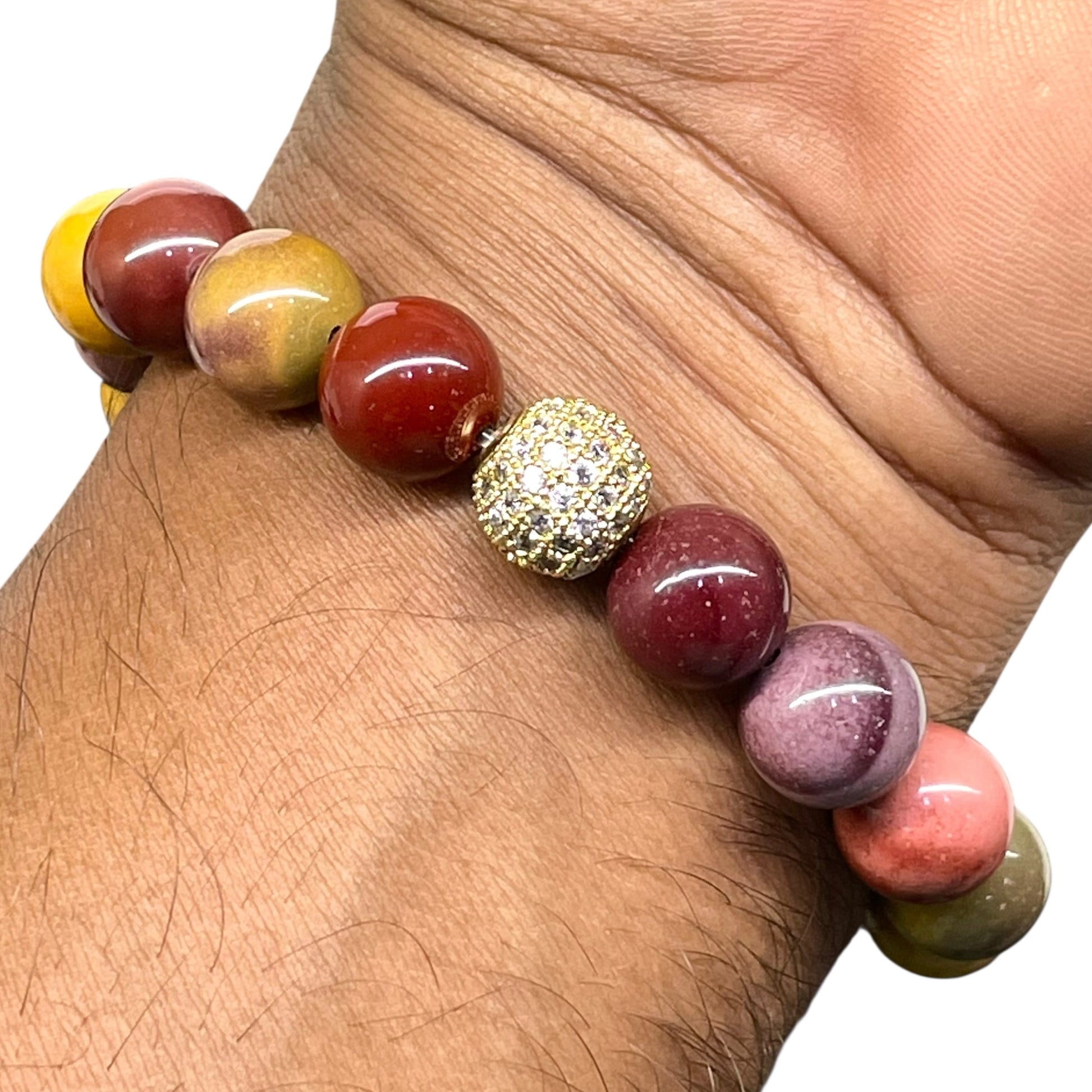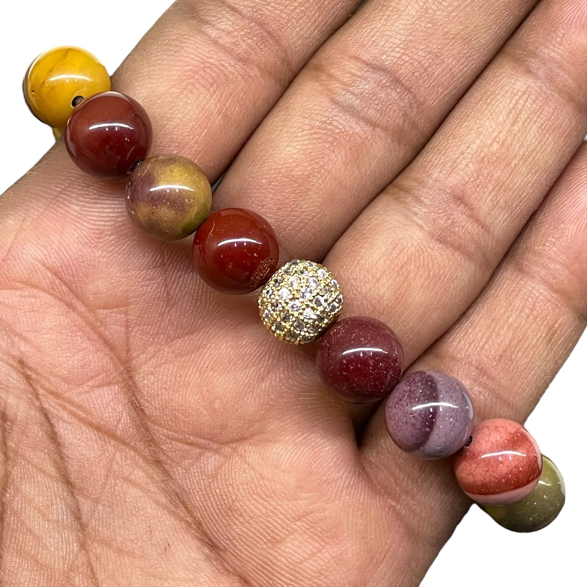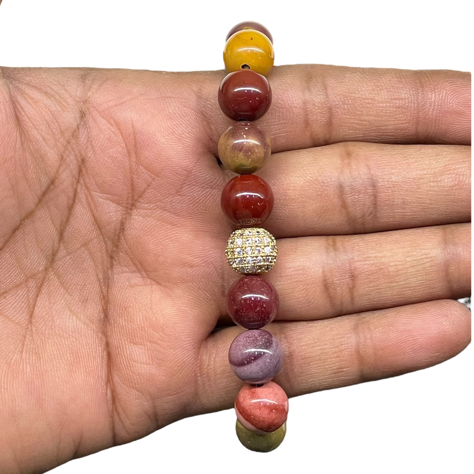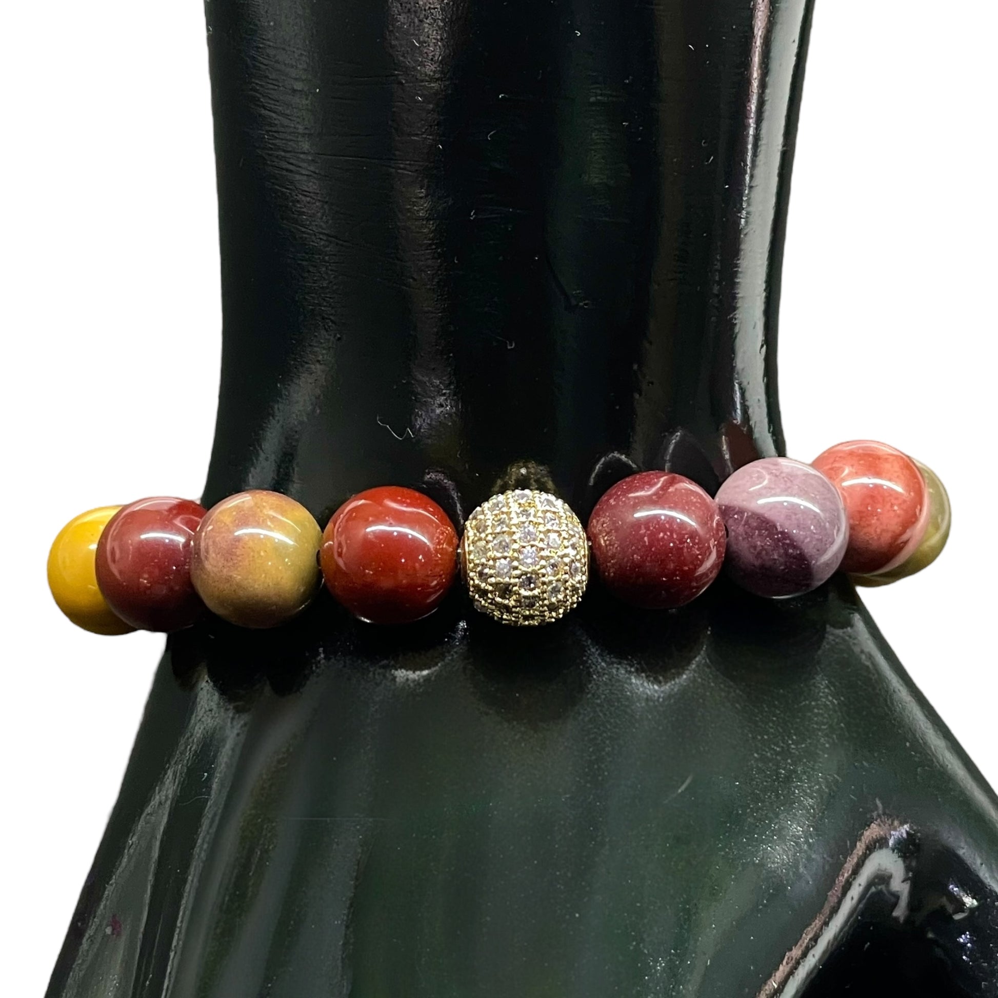 Handmade Mookaite Jasper Stretch Bracelet – 10mm Natural Beads with Golden Disco Ball Accent