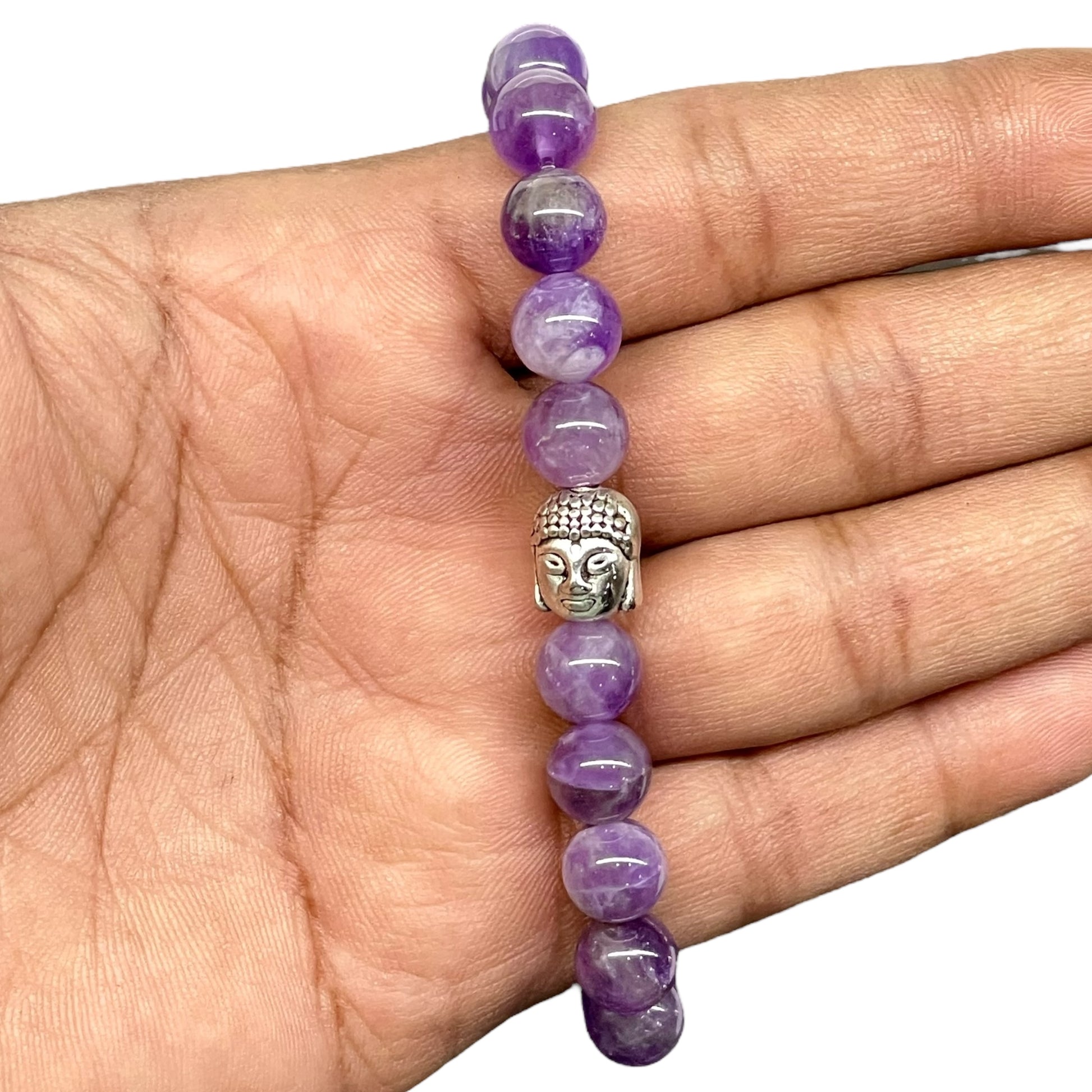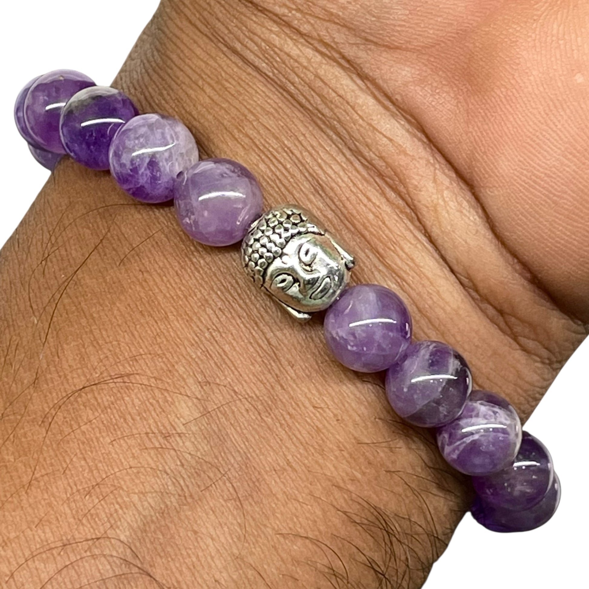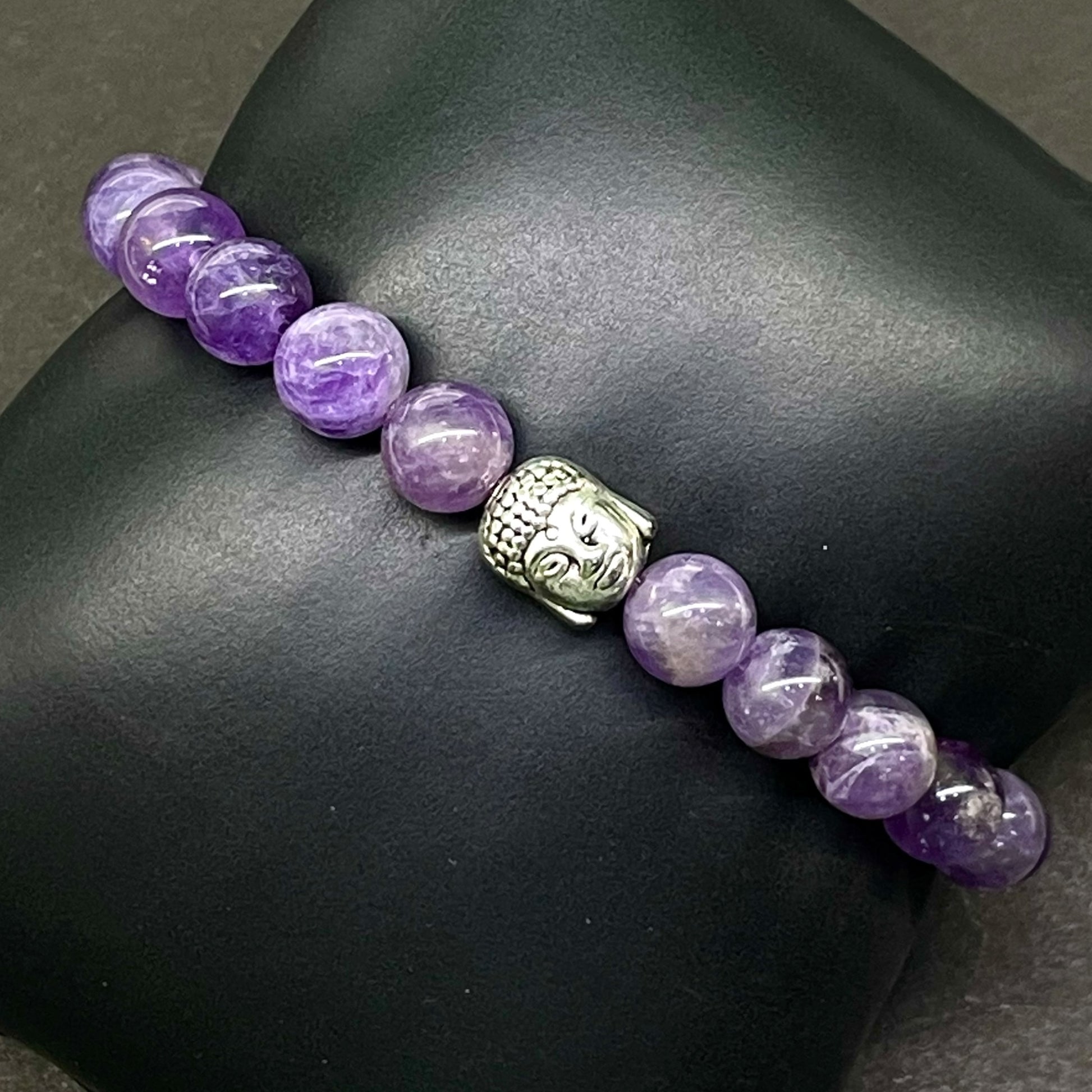 Handmade Amethyst Stretch Bracelet – 8mm Natural Gemstone Beads with Silver Buddha Head