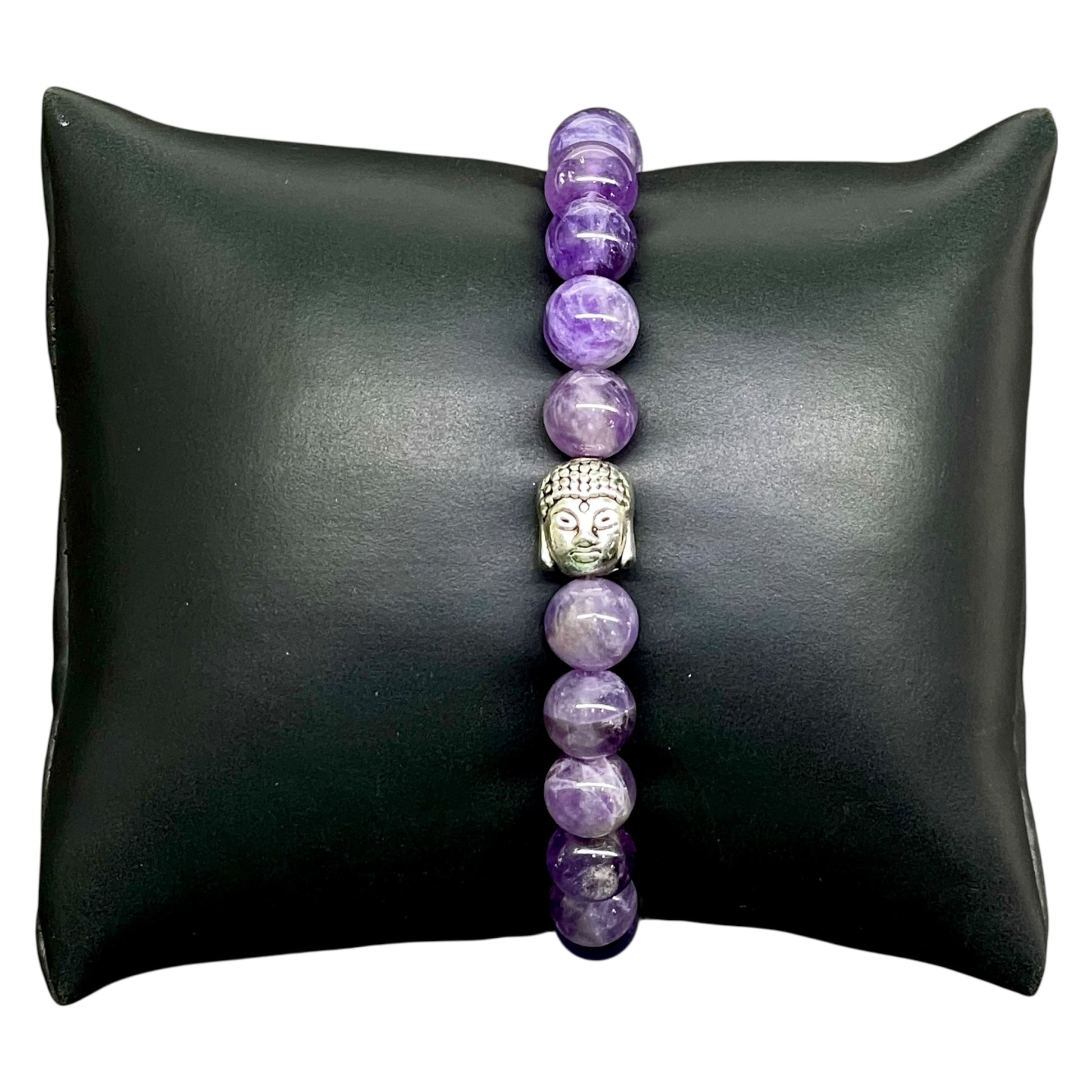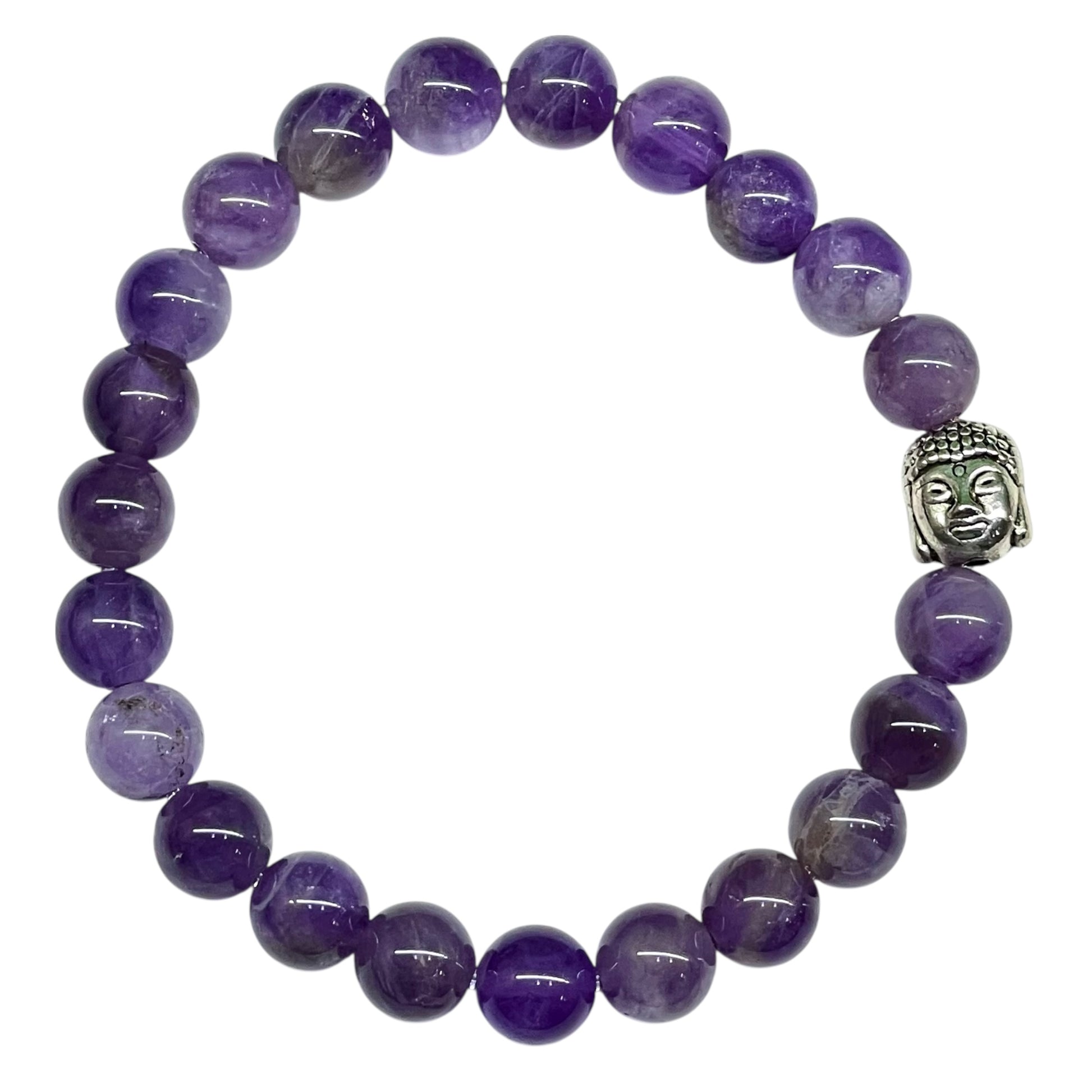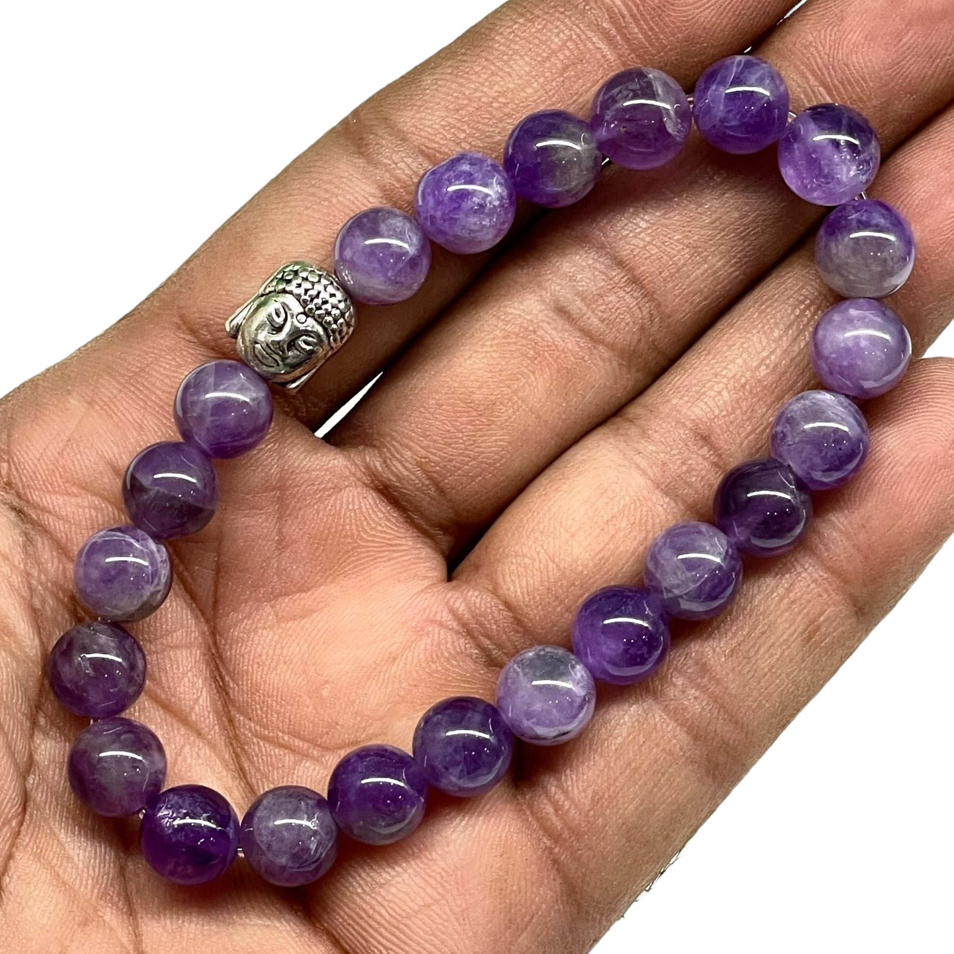 Handmade Amethyst Stretch Bracelet – 8mm Natural Gemstone Beads with Silver Buddha Head