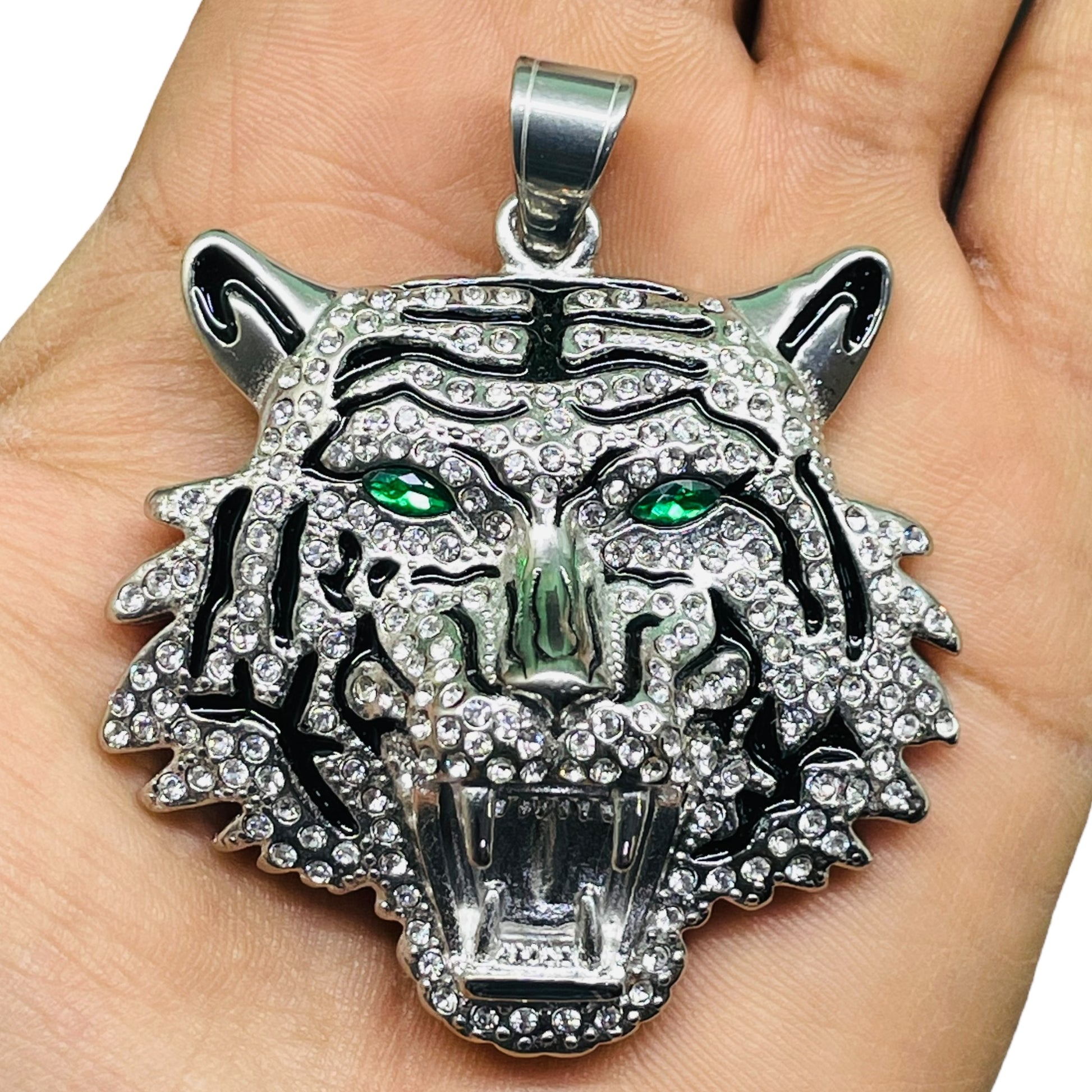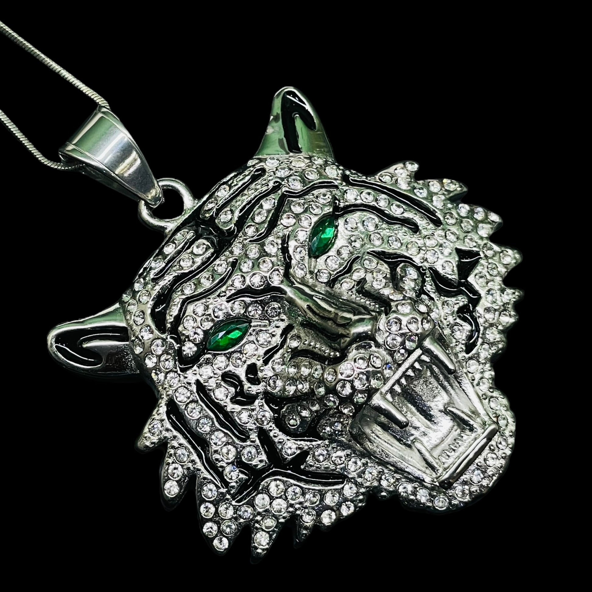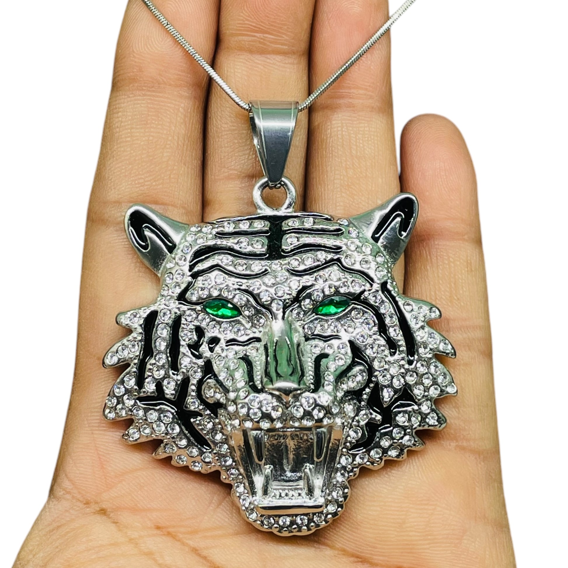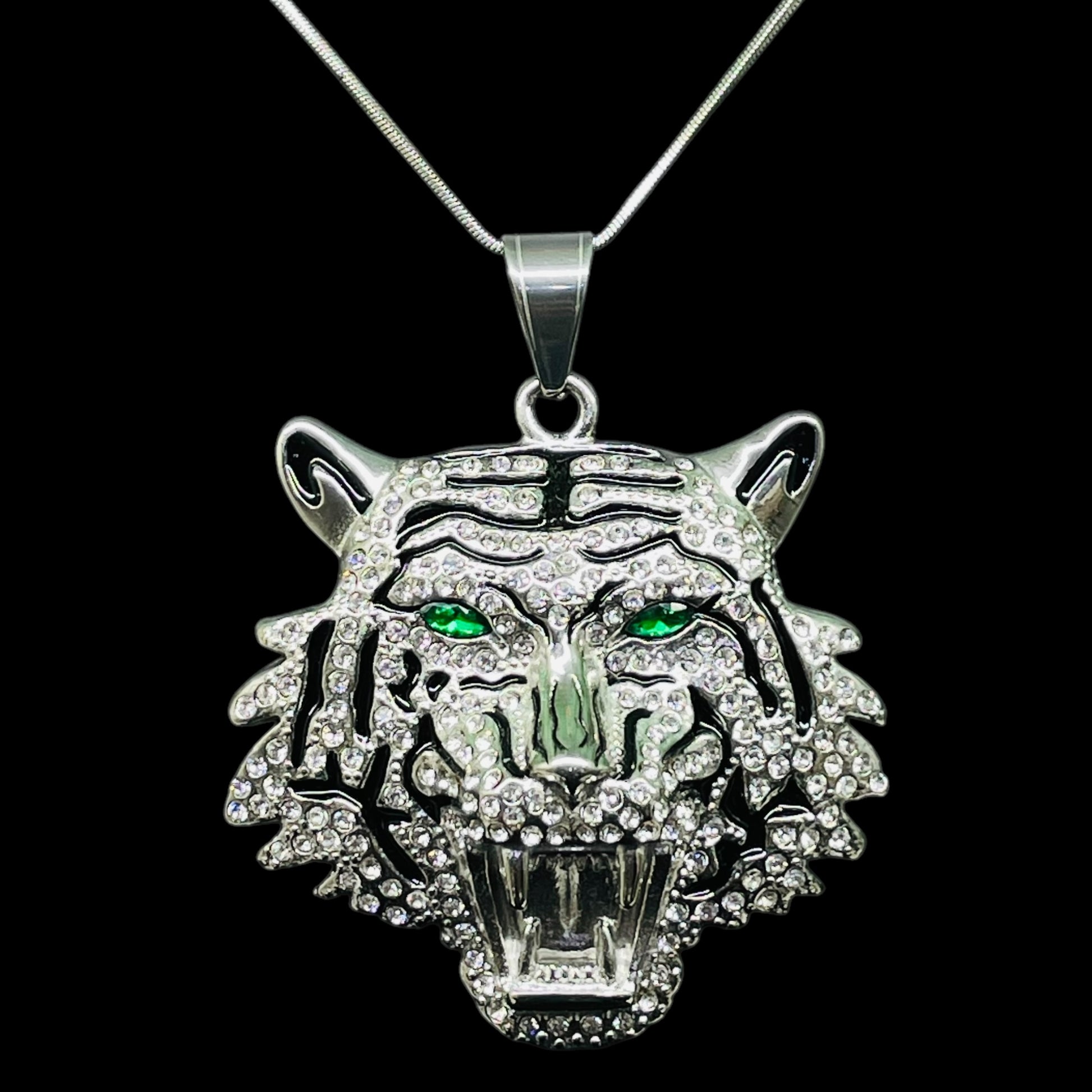 Iced Out Silver Tiger Head Pendant with Green Eyes – Hip Hop Necklace