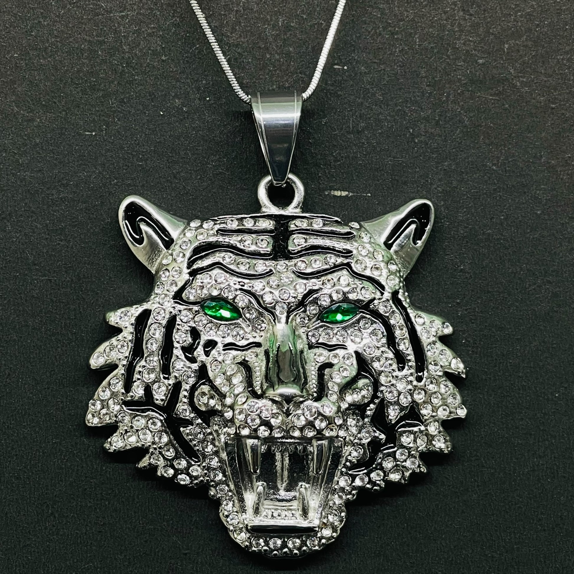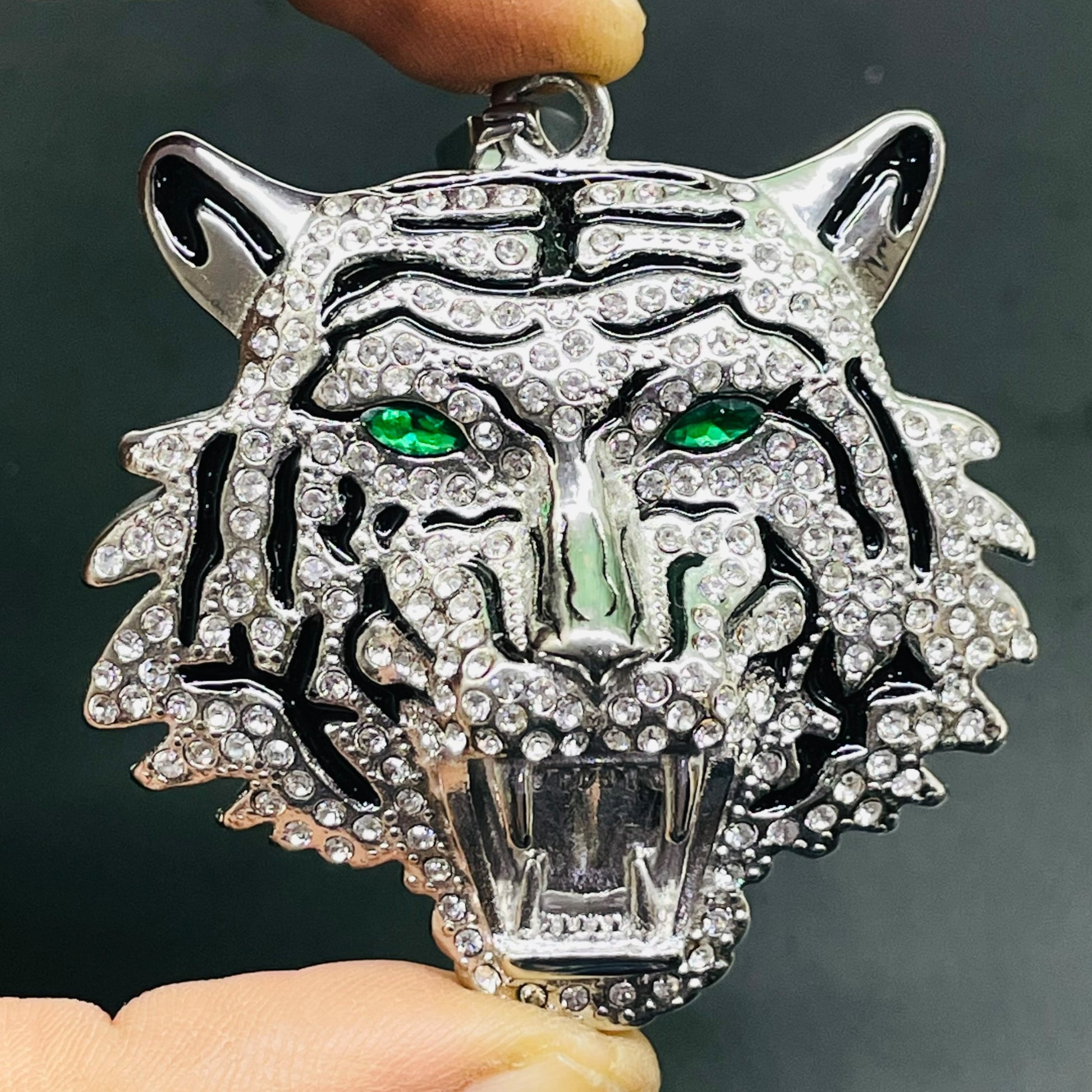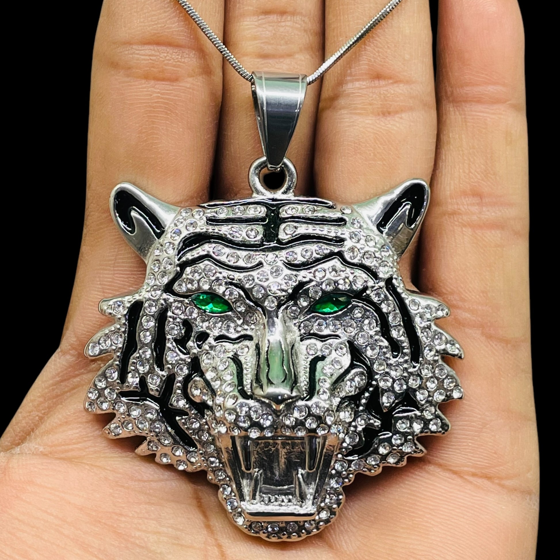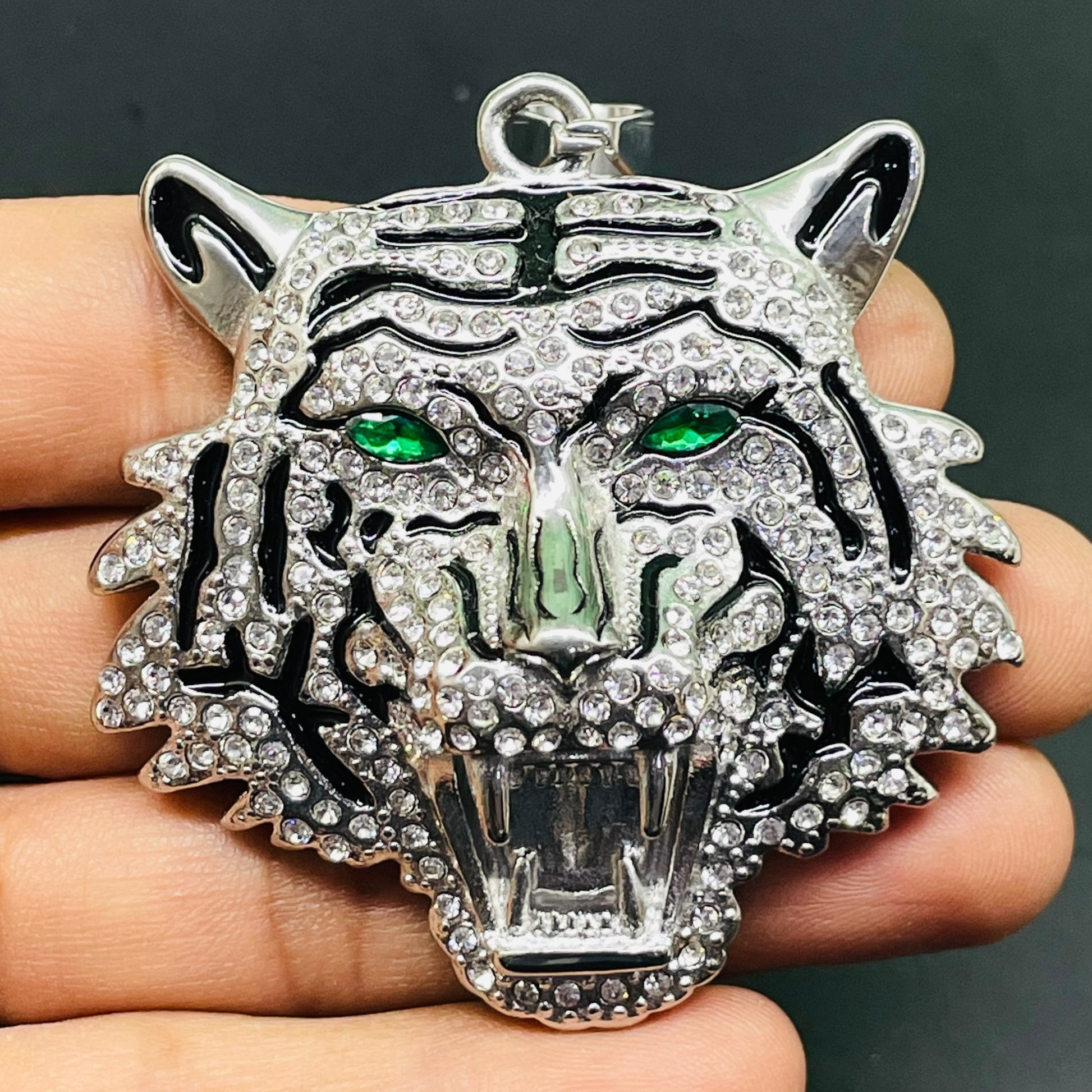 Iced Out Silver Tiger Head Pendant with Green Eyes – Hip Hop Necklace