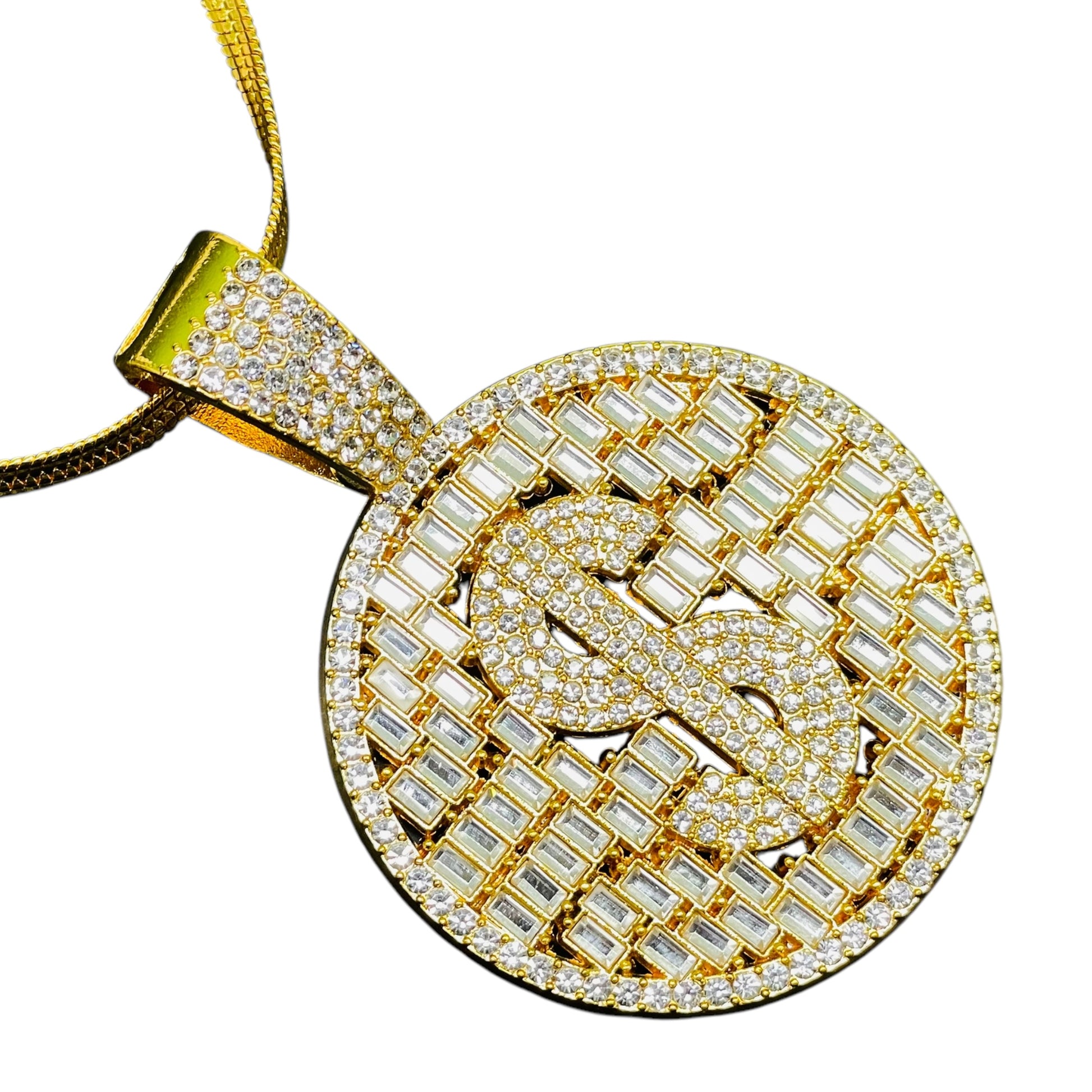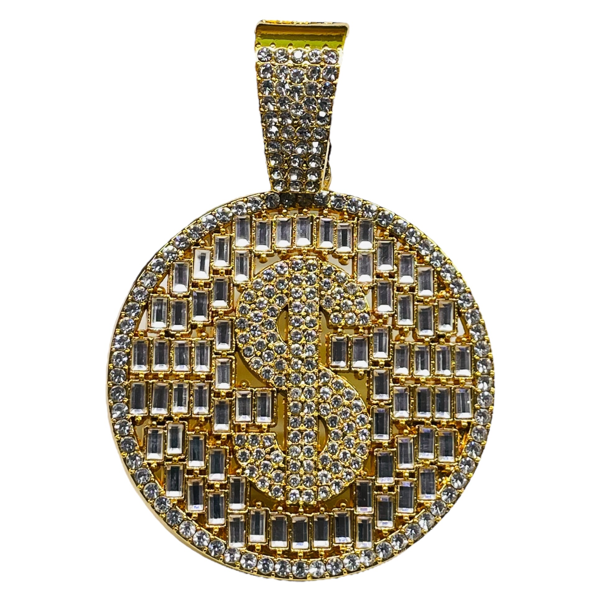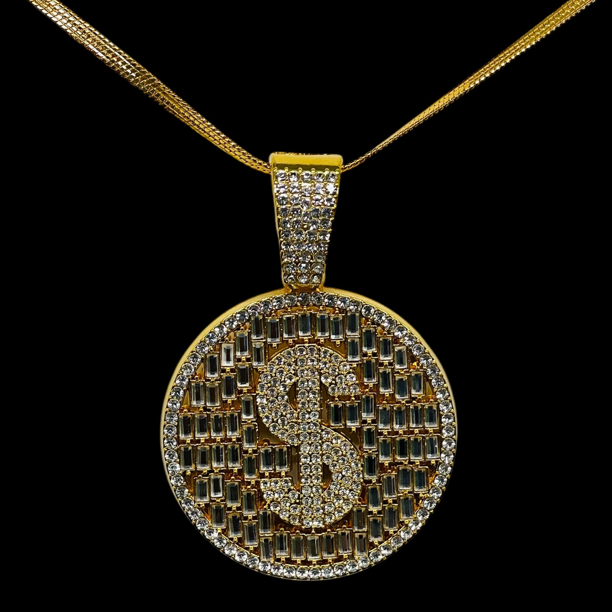 Iced Out Dollar Sign Pendant – Gold Round Bling Necklace