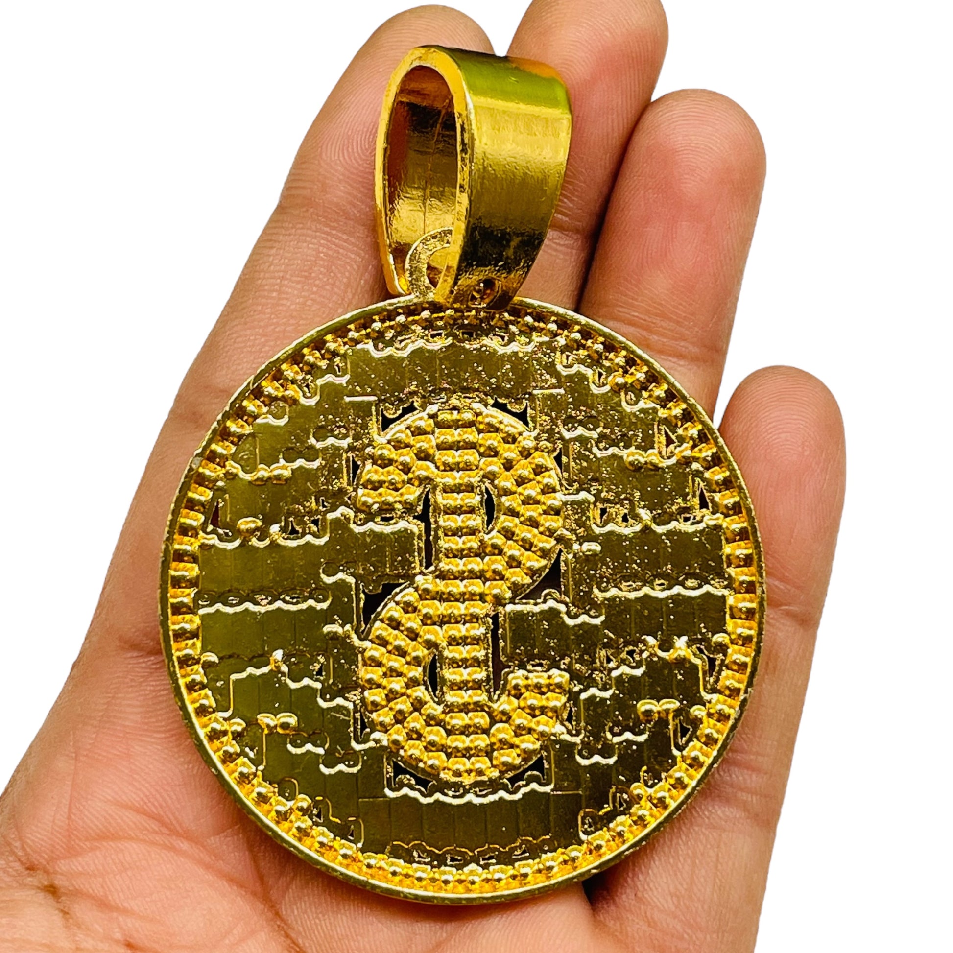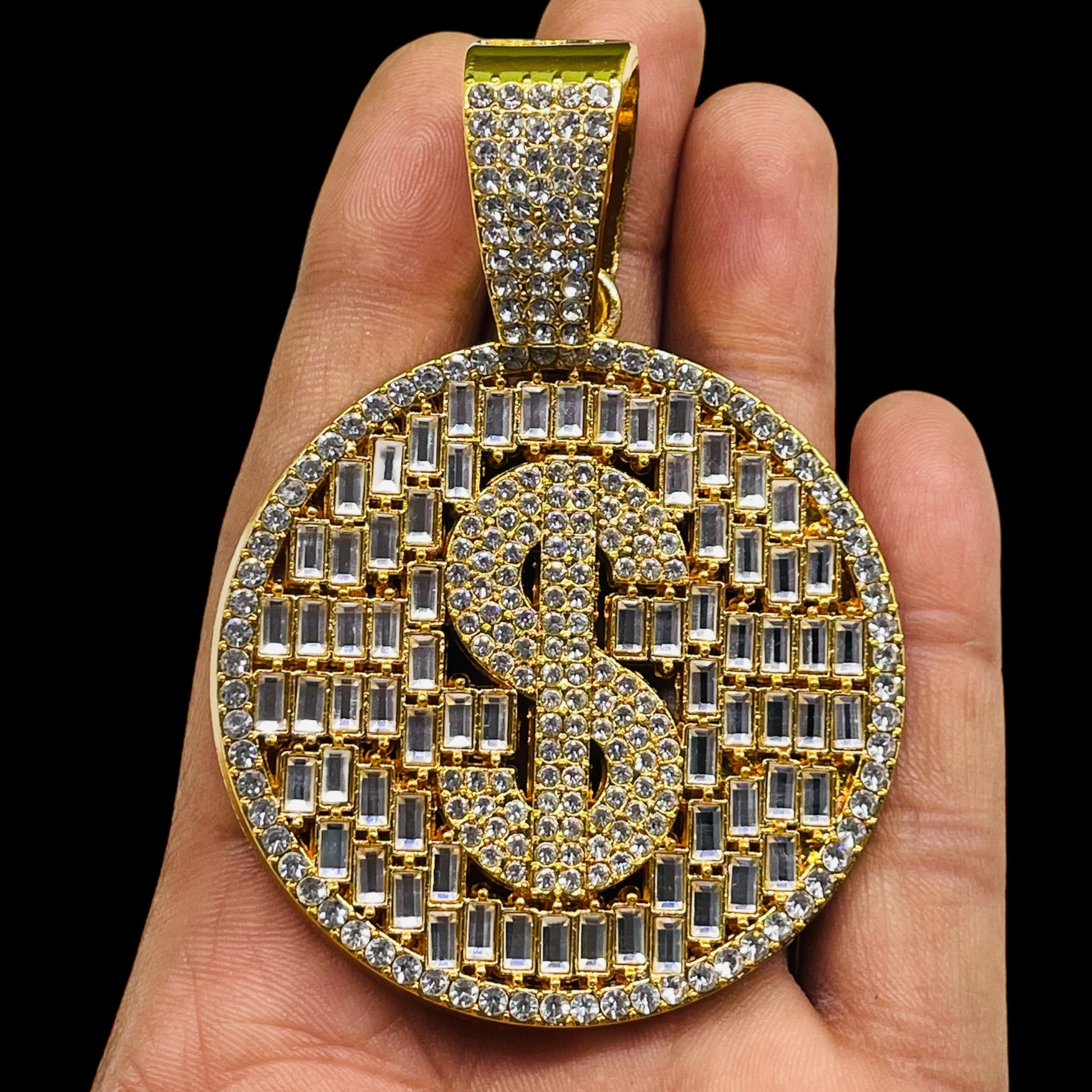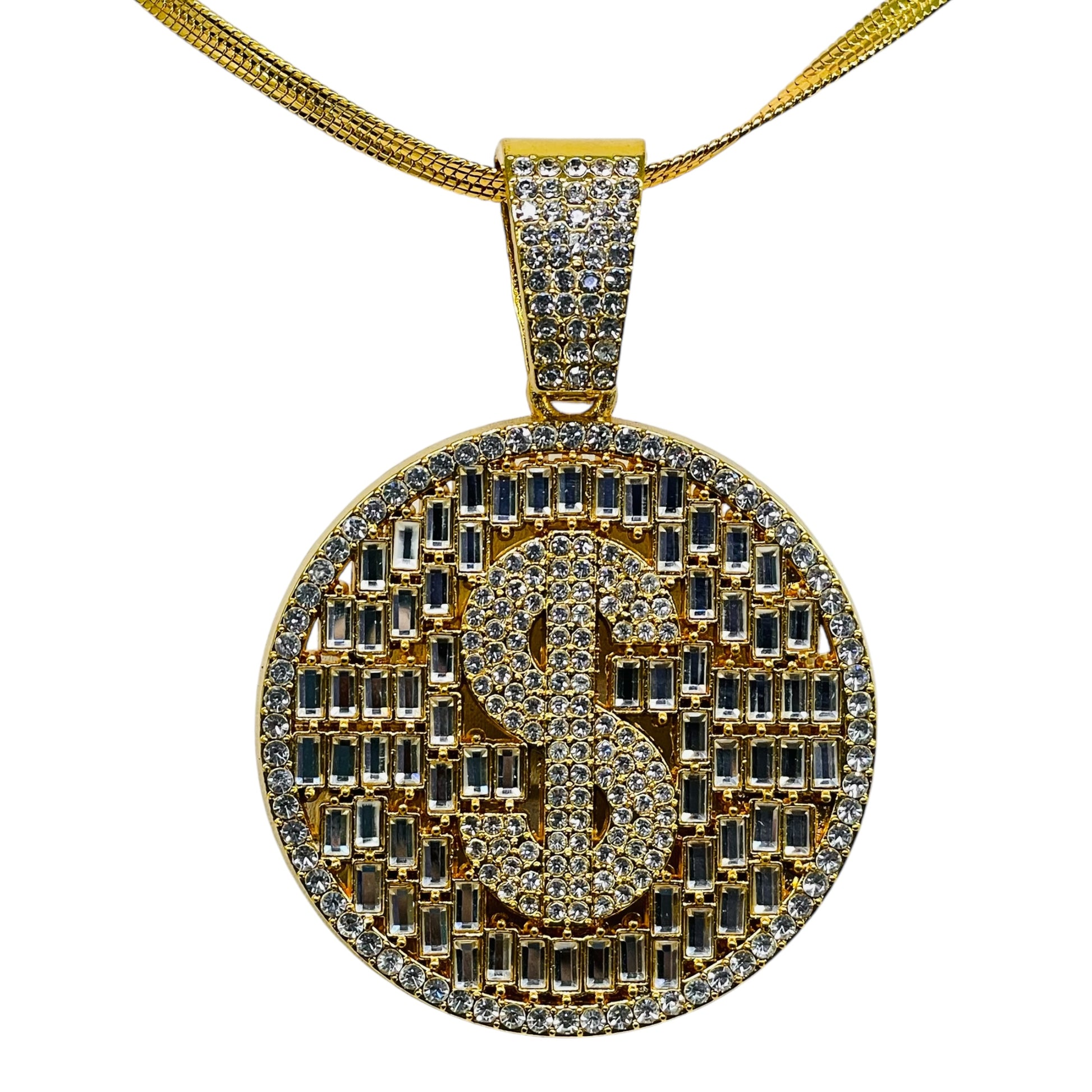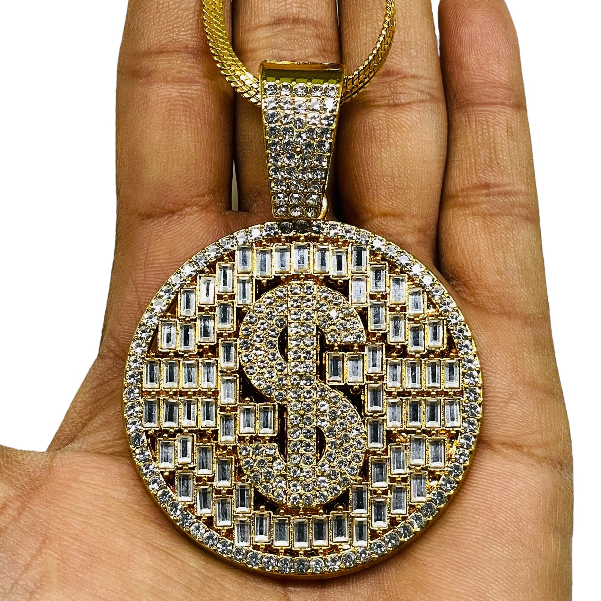 Iced Out Dollar Sign Pendant – Gold Round Bling Necklace
