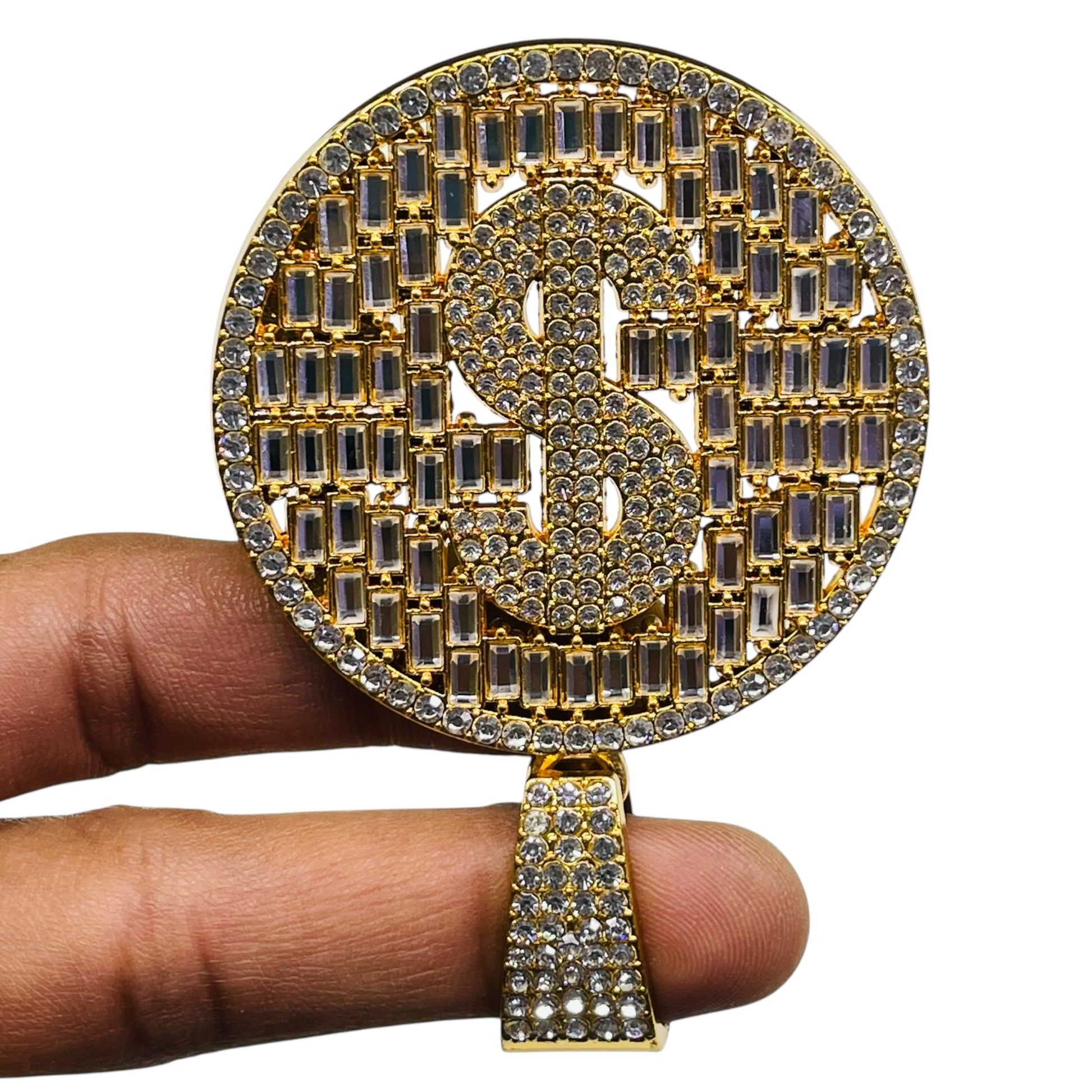 Show the world you hustle hard with our Iced Out Dollar Sign Pendant, a must-have for anyone chasing success and dripping in confidence. This round medallion pendant features a bold, pavé-set dollar sign encrusted in high-shine CZ stones, surrounded by an eye-catching pattern of baguette and round-cut crystals for maximum sparkle. Finished in a premium gold tone, it’s the ultimate symbol of wealth, power, and ambition.