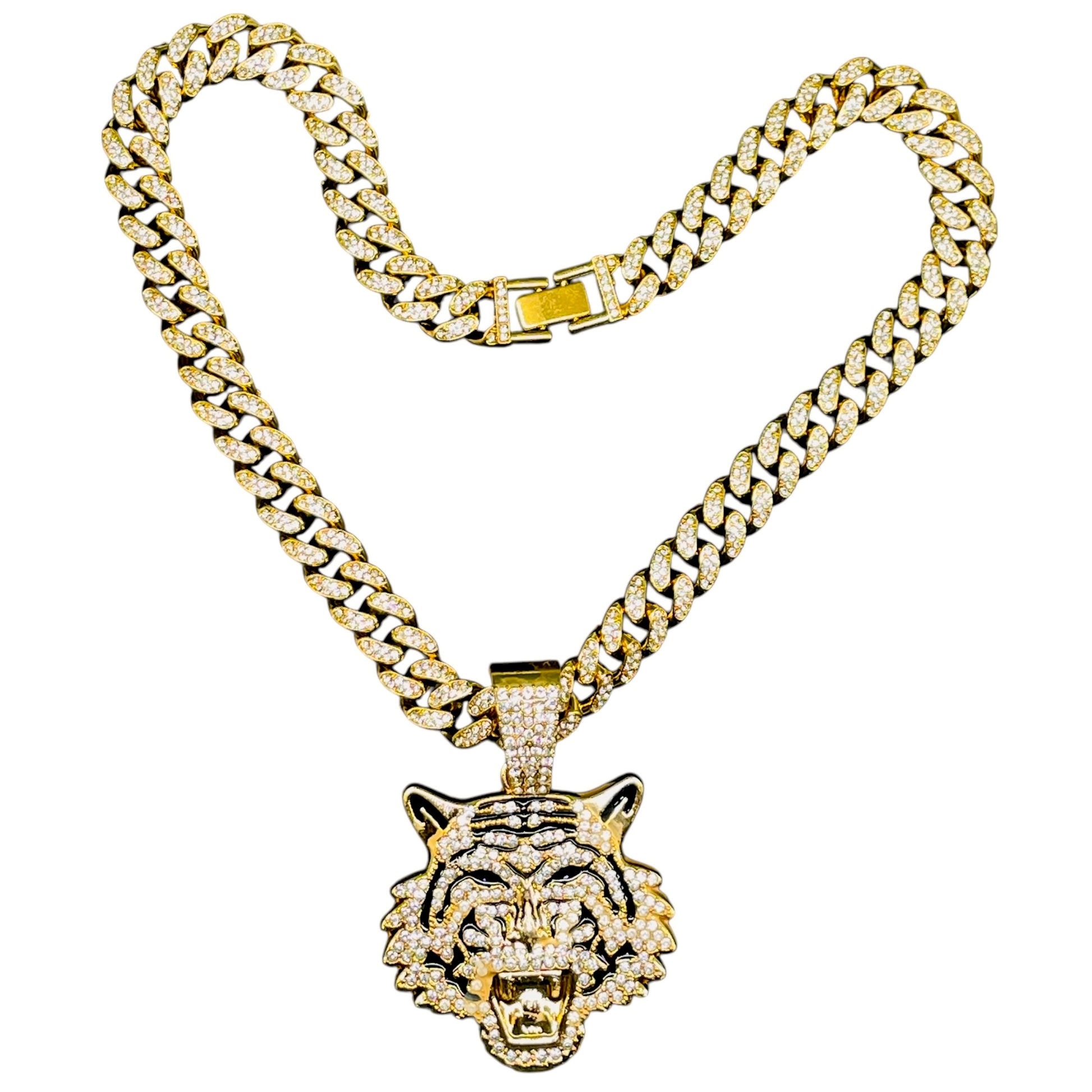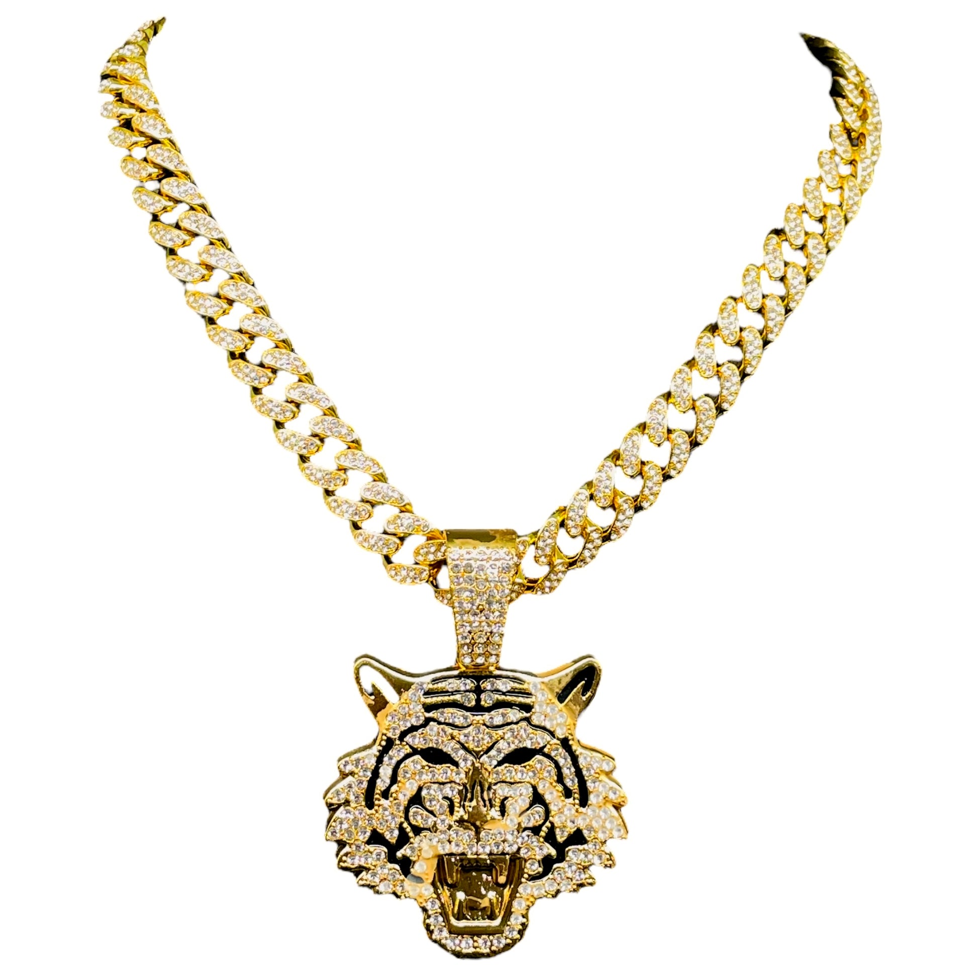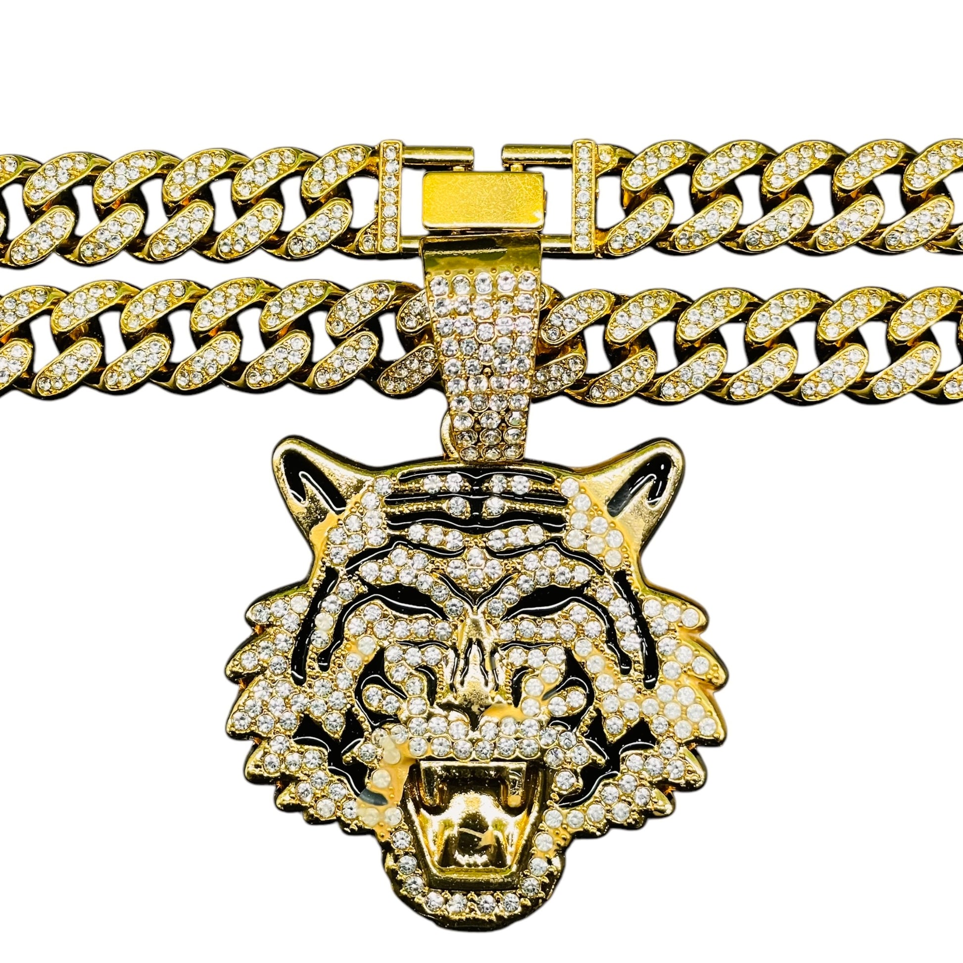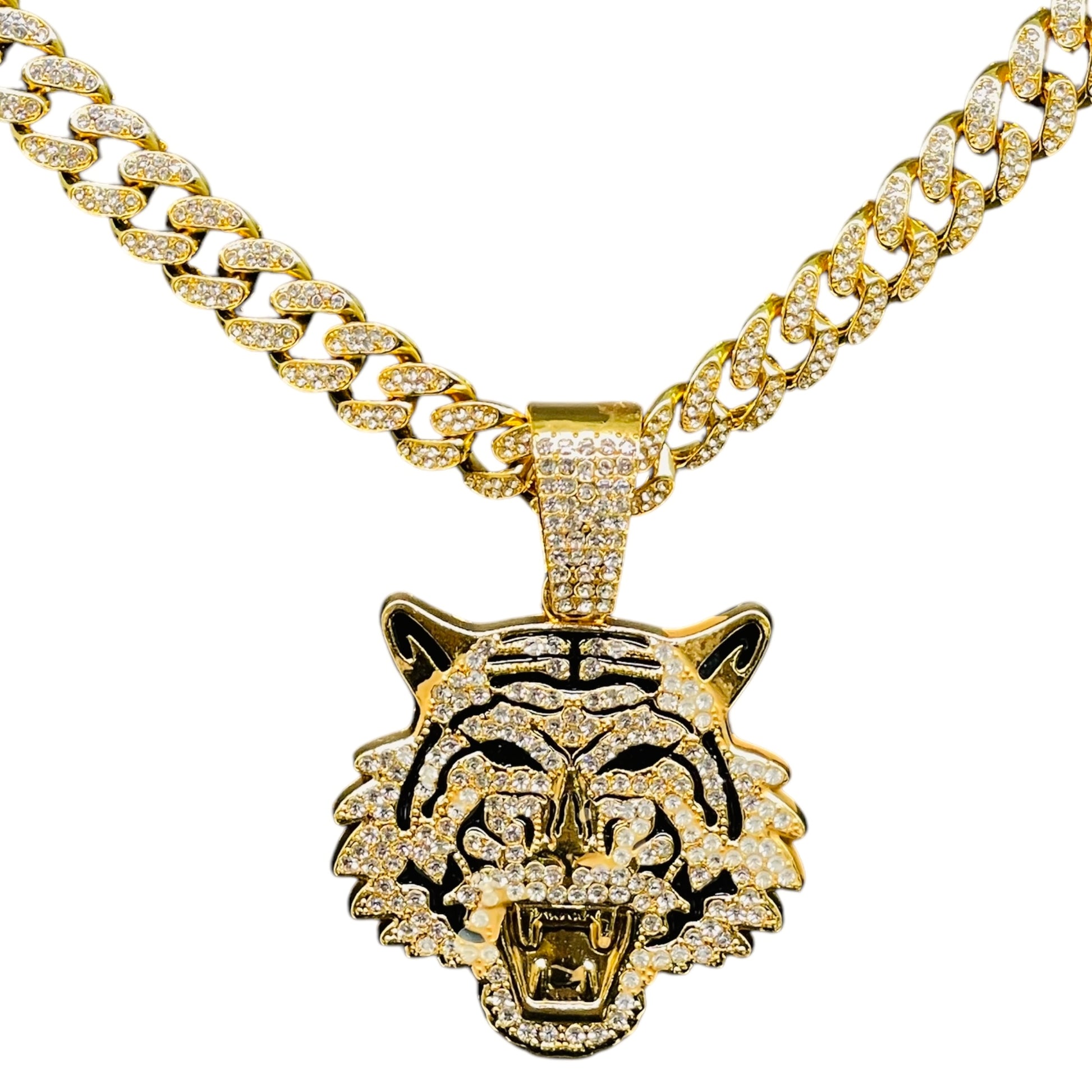 Iced Out Gold Tiger Pendant Necklace – Bold Cuban Link Chain